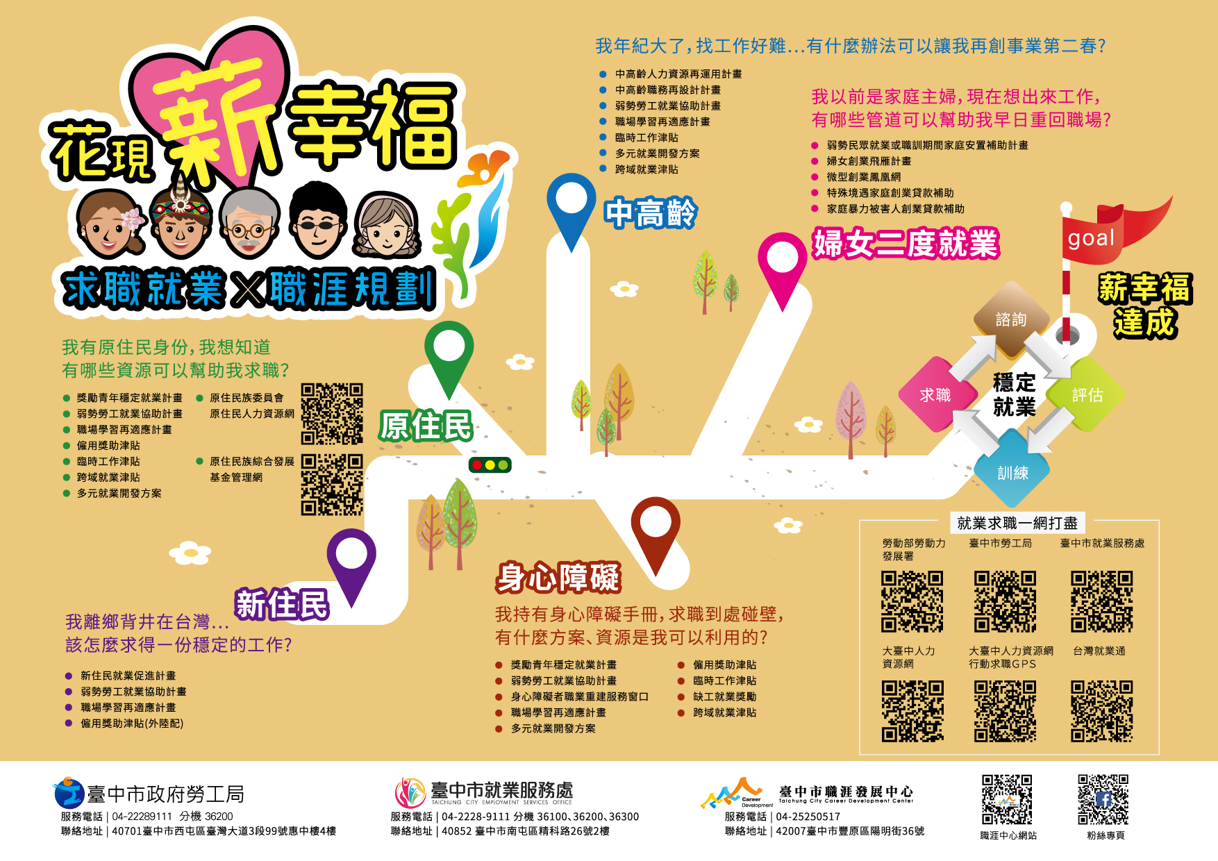 今年5月台中市政府勞工局首推「青年求職地圖」,讓青年按圖索驥輕鬆了解專屬青年的各項就業資源,淺顯易懂的方式獲得民眾廣大迴響;為讓更多求職民眾運用求職資源,勞工局再加碼針對新住民、原住民、中高齡者、二度就業婦女及身心障礙者等特定對象,依其就業困境與需求,將就業資源分門別類製作成新版「薪幸福求職地圖」,幫助民眾排除就業障礙,勇闖職場。