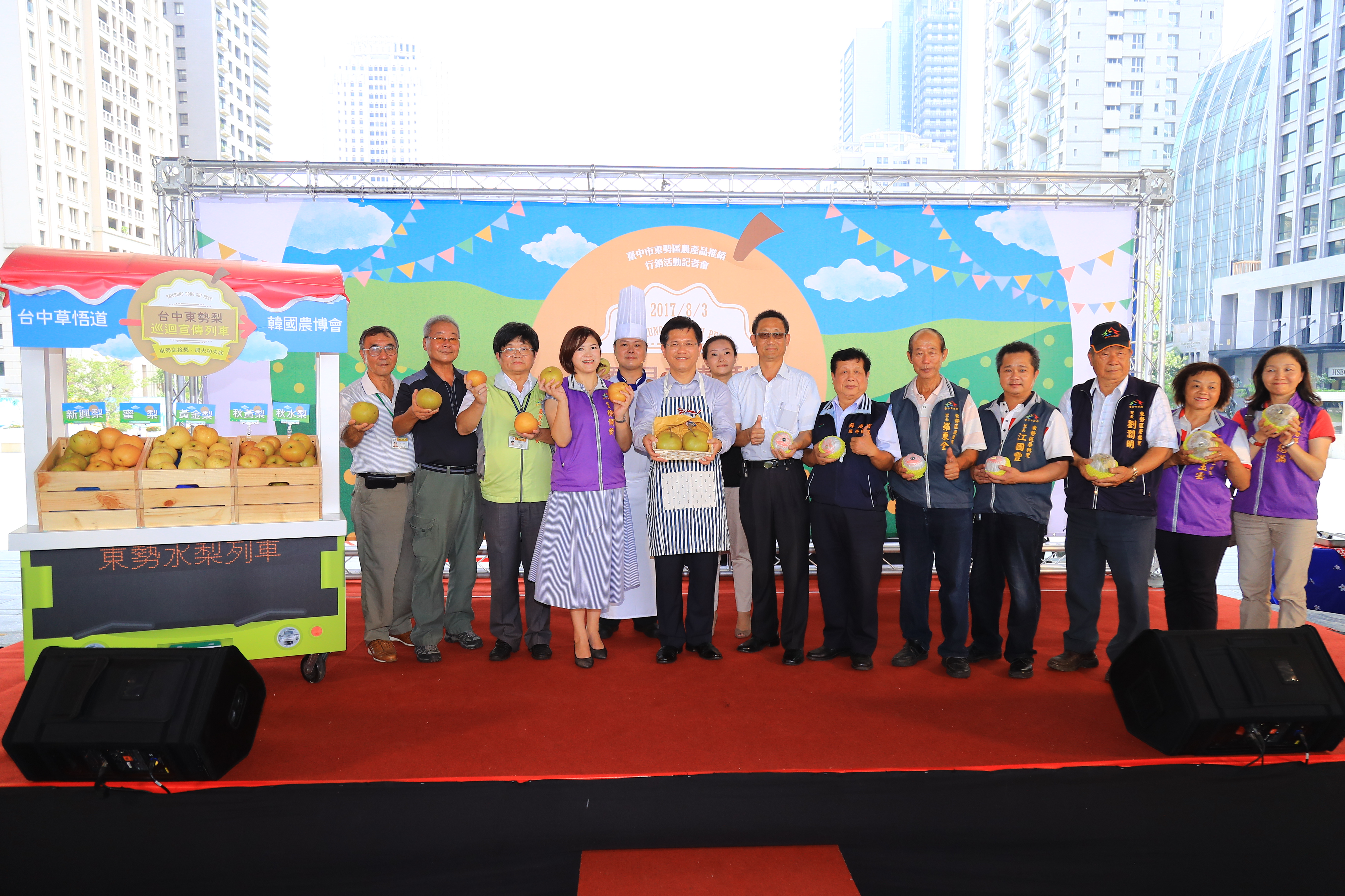 「看見東勢梨」系列行銷活動記者會今(3)日在台灣大道市政大樓舉辦,包括林市長、農業局副局長蔡勇勝、東勢區長徐佩鈴等人都到場共襄盛舉,活動現場邀請台中公園智選假日飯店主廚示範水梨創意料理、青楓舞劇坊帶來梨花舞蹈,並展示東勢梨巡迴宣傳列車。包括市議員蘇慶雲也派員到場致意。