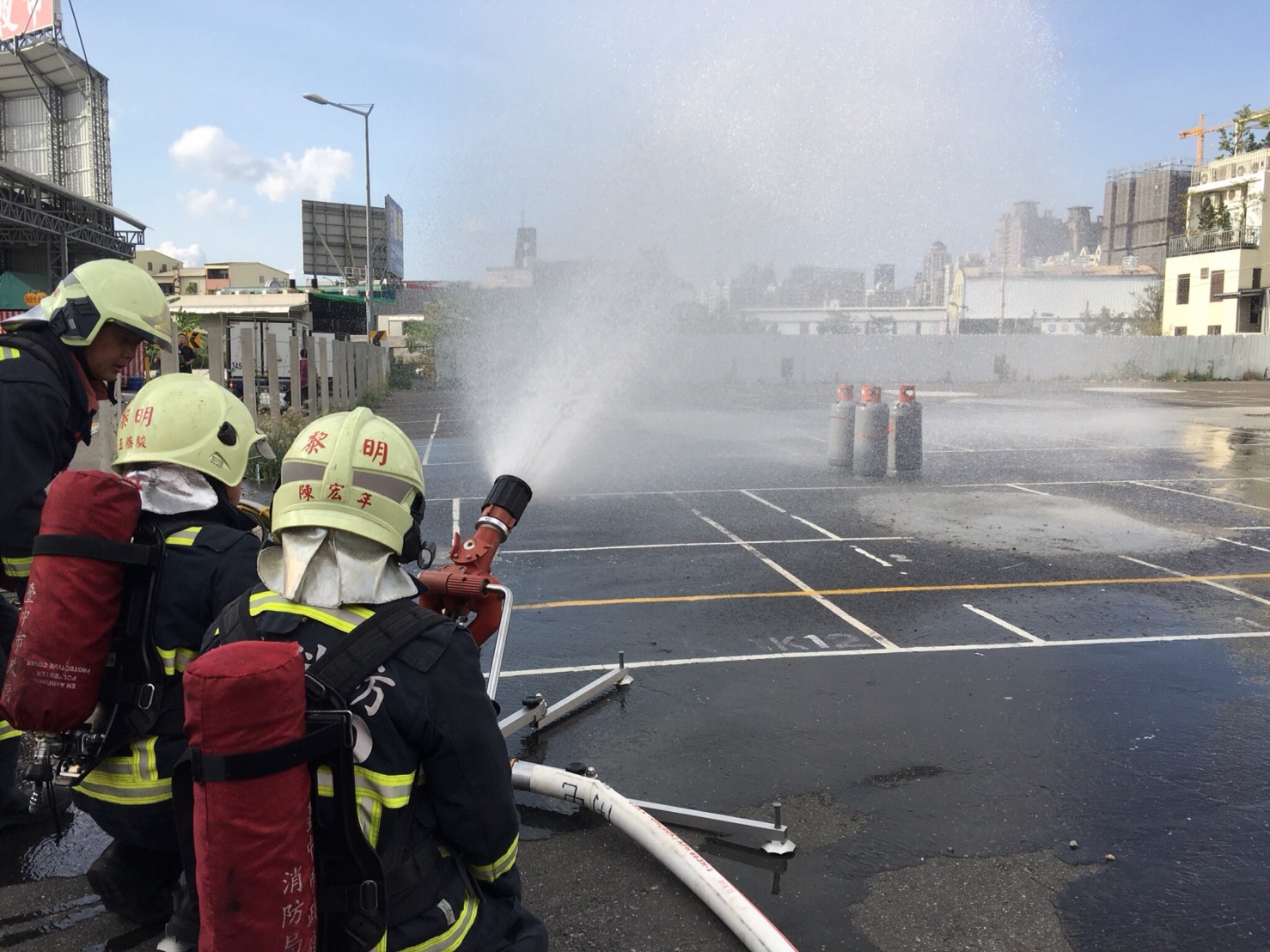 昨日兩場演練假想夜市攤販煮食不慎,造成瓦斯鋼瓶洩漏引發氣爆,造成多名員工及民眾輕重傷,並波及到鄰近攤販,且附近兩支瓦斯鋼瓶遭波及,氣體持續外洩。演練搶救內容包含夜市營業人員進行依自衛消防編組初期應變,包含通報、滅火、避難引導;分隊抵達後進行滅火攻擊、部屬水線、週界防護等。