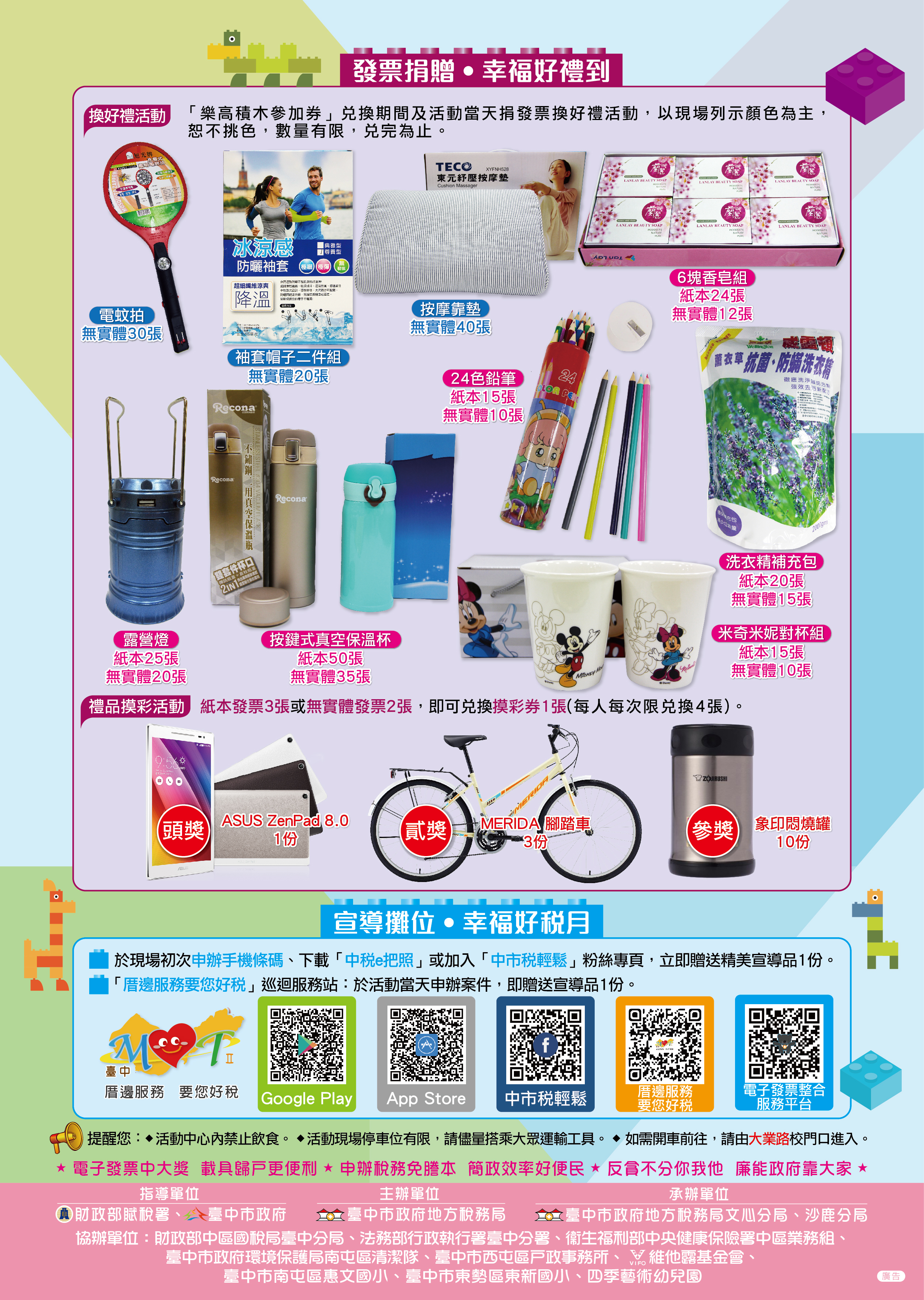 此外,為鼓勵民眾使用載具儲存電子發票,兌換參加券期間及活動現場都設有手機條碼申辦與發票捐贈專區,捐贈紙本或無實體發票即可兌換保溫杯、按摩靠墊、露營燈等多項好禮,募得發票並將全數捐贈予慈善公益團體,響應公益做愛心。