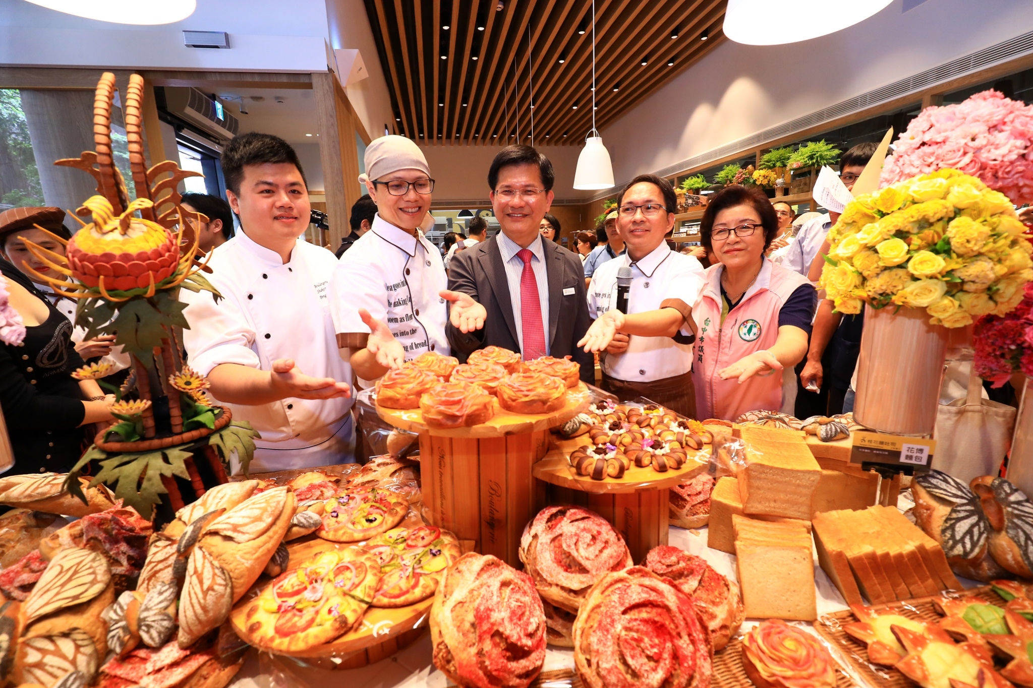 林市長說,台中旗艦店劇場式設計,讓麵包製作過程一覽無遺,就像看一齣現場演出的戲劇,除了食安,體驗式的呈現方式更是有創意。而吳寶春師傅是「台中製造」的台灣之光,30年前初為學徒,在台中學藝,留下非常寶貴的記憶,因此把最好的獻給台中,不但為花博創作7款花博麵包,運用不同的在地食材與故事,呈現花博訴求的溫暖滋味,把最好、最大、最有特色的旗艦店開在台中,他對此要表示感謝。