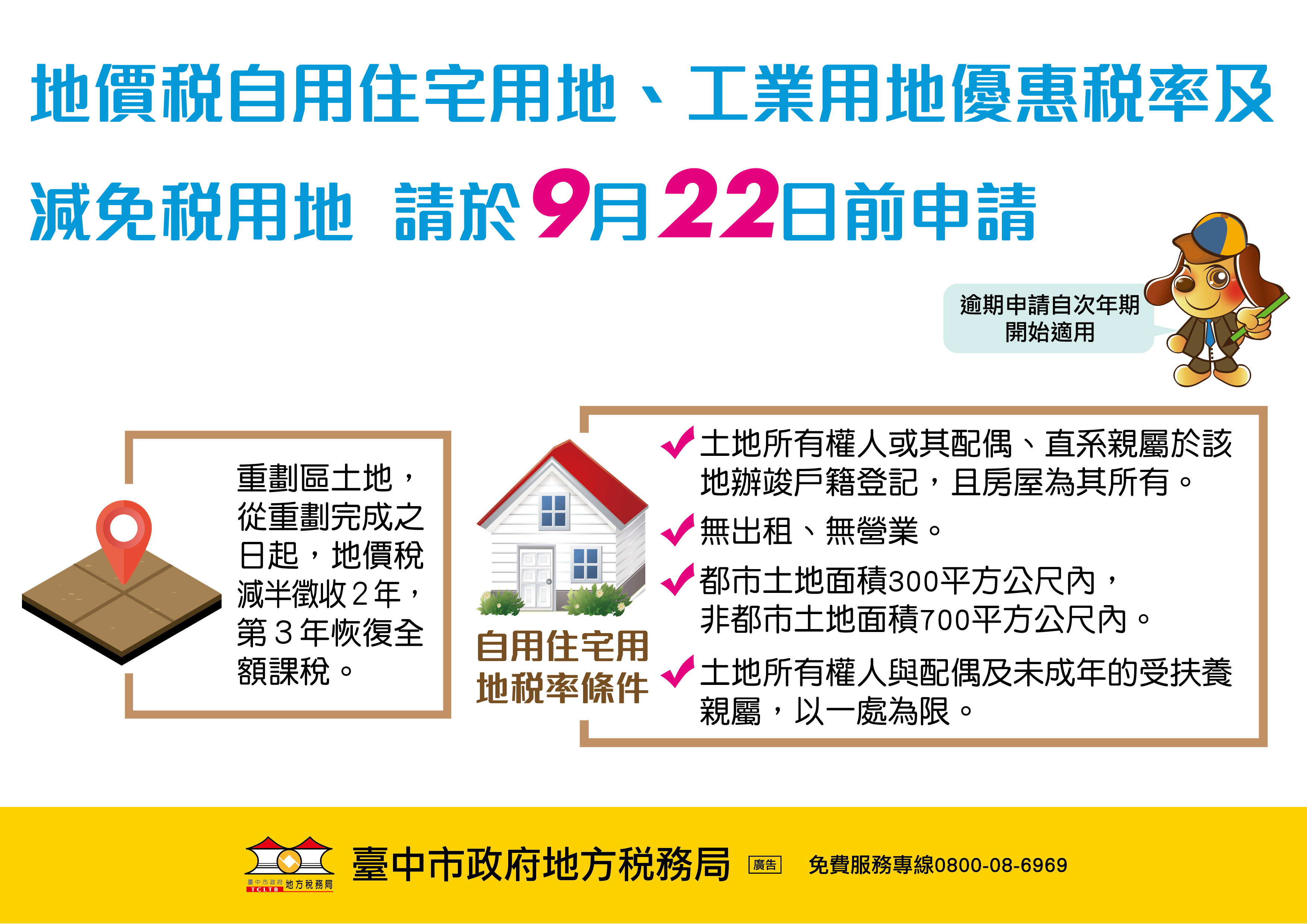 地方稅務局說明,土地所有權人的土地如符合下列自用住宅用地或工廠、加油站、停車場等事業直接使用土地,以及無償提供公眾通行道路土地、其他符合減免規定的各類土地條件,即可申請以特別稅率課徵或減免地價稅。