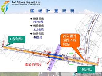 2018台中世界花卉博覽會重要聯外道路工程之一「中部科學工業園區后里園區-西向聯外道路開闢工程」,東起后科路三段,西至眉山路,全長900公尺,路寬由原先的19公尺拓寬至40公尺,工程上月完工,成為首條完成的花博聯外道路。市長林佳龍肯定邁開「花博第一哩路」,盼透過花博帶動地方建設,打造台中市成為花園城市。