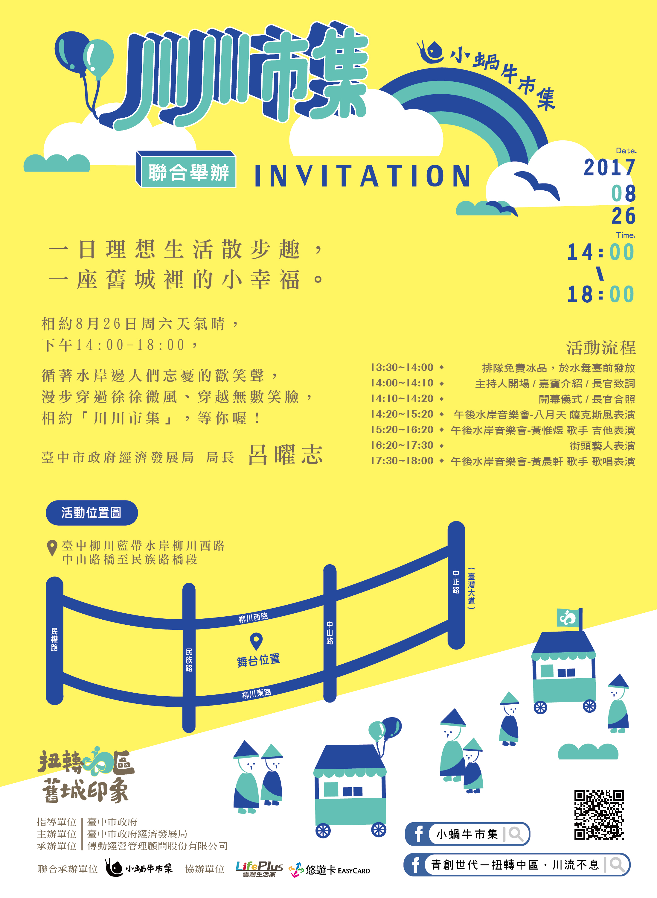 「2017川川市集x小蝸牛市集」將於26日(六)下午在柳川藍帶水岸的柳川西路(中山路橋至民族路橋段間)人行道登場,邀請審計新村小蝸牛市集團隊共同參與,讓台中在地職人、青年創業家及商圈店家一同匯聚柳川河畔,展售創新創意產品,當天開幕現場將發送200支冰棒,還有知名樂團、歌手及街頭藝人表演,邀您一同享受盛夏的午後約會;梧棲漁港以豐富的現撈海產遠近馳名,且鄰近高美濕地,26日(六)舉辦「2017台中梧棲小卷季」,現場提供4,000份小卷料理,歡迎大家免費品嘗!