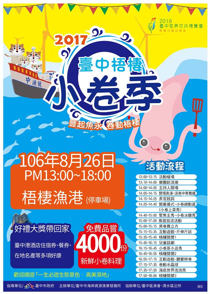 梧棲小卷季活動從26日(週六)下午1點開始至6點結束,現場除了有美味小卷要與大家分享外,還有樂團表演、冰雕秀、舞蹈表演、兒童劇團、趣味闖關及手作DIY等精彩節目演出,要讓大家在梧棲漁港有得吃、有得玩,共同體驗「2017台中梧棲小卷季」的年輕、活力與創意!