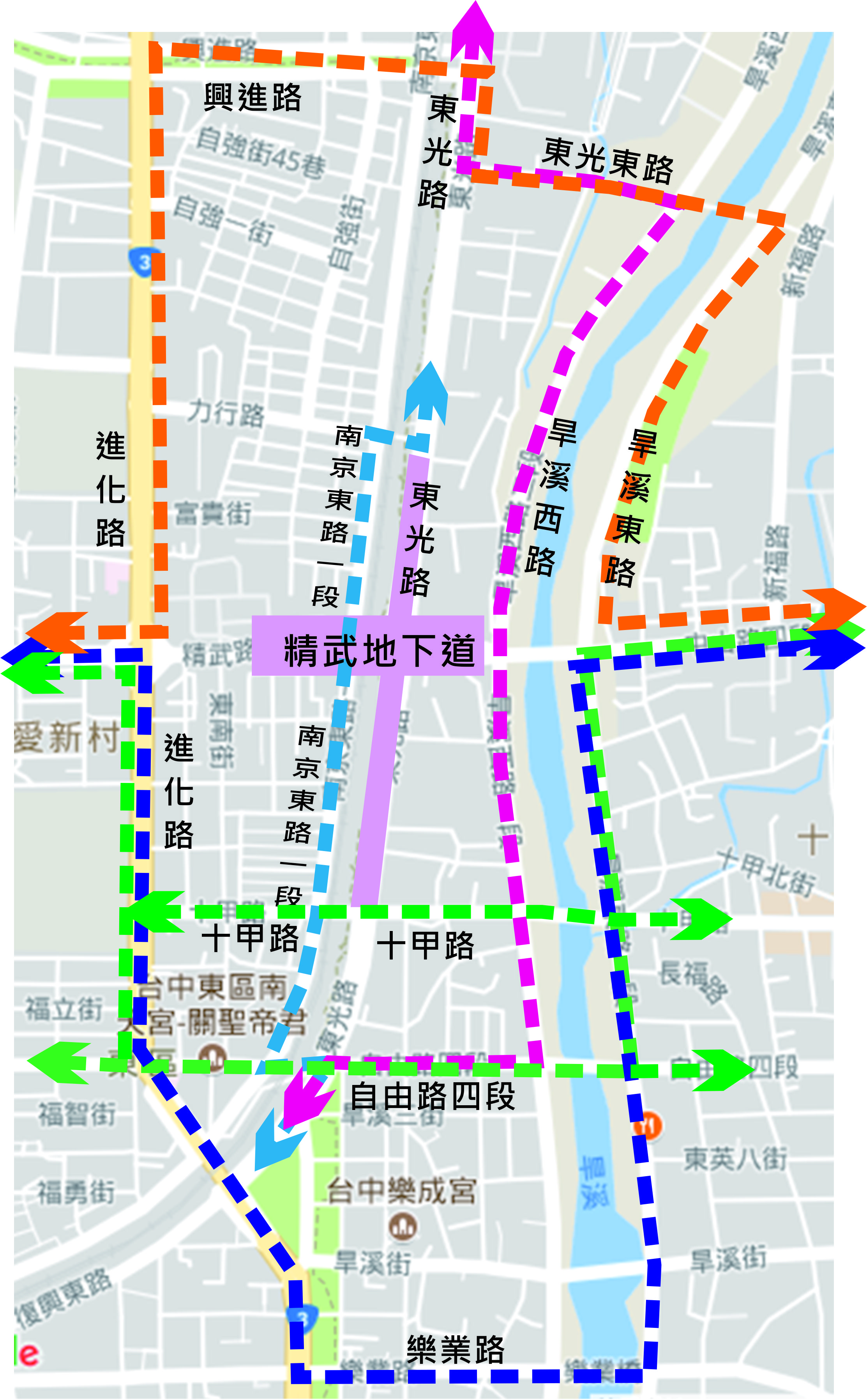 交通局補充,精武路地下道兩側的側車道不會封閉,機車族仍可以通行。機車往市區方向建議行駛精武路→東光路→力行路→南京東路→精武路。機車往太平方向建議行駛精武路→南京東路→十甲路或自由路→東光路→精武路。