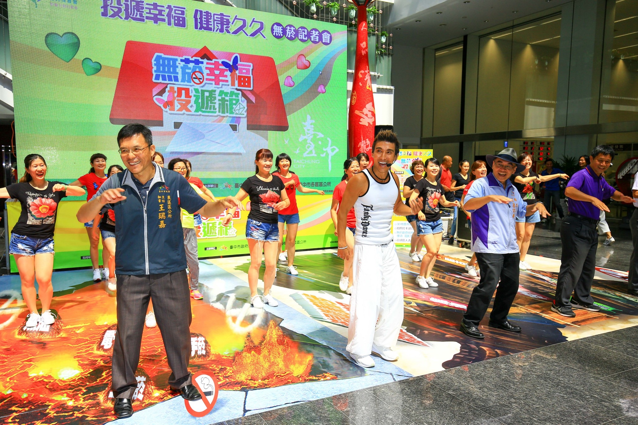 市府衛生局今(5)日於台灣大道市政大樓舉行「投遞幸福 健康久久」無菸記者會,衛生局長呂宗學、市議員劉士州、各區區長、「健康大使」潘若迪等人,共同將愛的明信片投入「無菸幸福投遞箱」,關懷支持親友進行戒菸;隨後由潘若迪現場示範「無菸健康有氧操」,邀請市民一起「舞健康 就是腰瘦」。