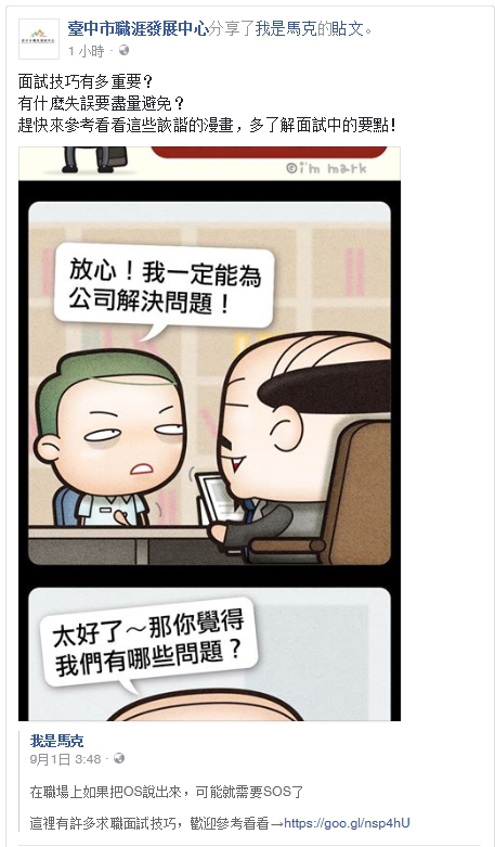 「面試煉金術」插漫畫已陸續上傳至「臺中市職涯發展中心」臉書粉絲專頁(https://www.facebook.com/TaichungCDC)。欲報名職涯講座活動及面試技巧指導服務,請洽詢台中市職涯發展中心(http://cdc.taichung.gov.tw/),服務專線:04-25250517、04-22289111分機36472。(9/5*7)*勞工局