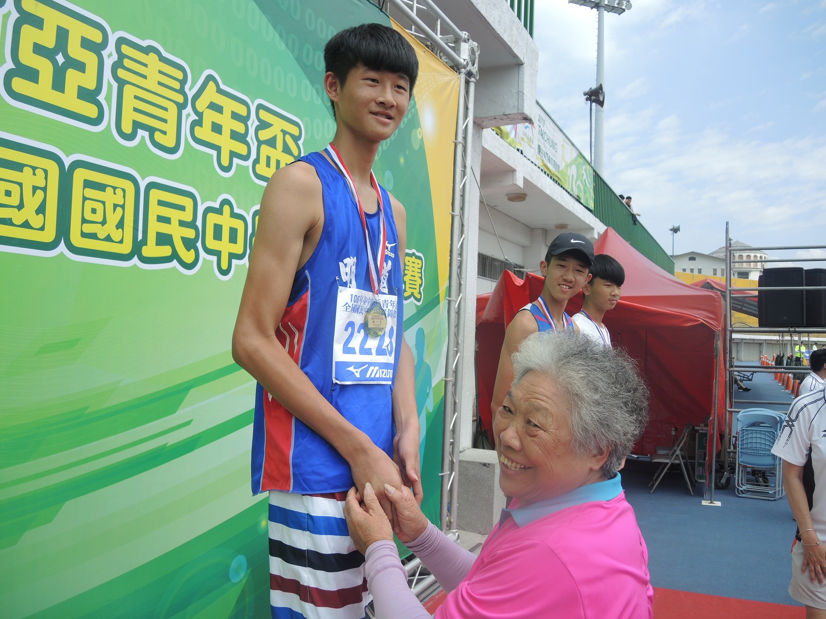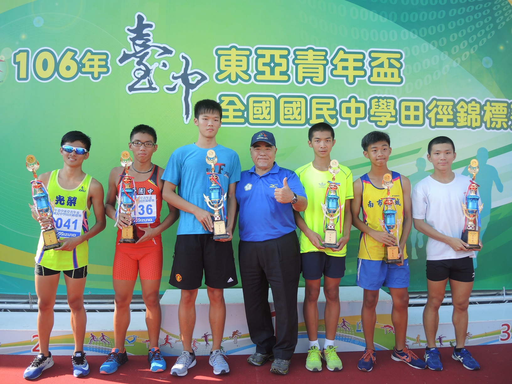 106年台中東亞青年盃全國國民中學田徑錦標賽今(16)日落幕,來自全台灣共69校歷經連三日較勁,團體總錦標由新北市光榮國中在男子組稱王,雲林縣東南國中則在女子組封后。至於男子組跳高項目,由台中市明道高中陳威宇跳出1.81公尺勇奪冠軍。市府運動局主秘郭明洲出席為選手頒獎外,也期勉明年選手明年到台中參加全國中等學校運動會。