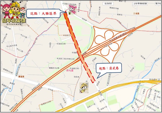 中清路三段因鄰近大雅交流道,行車流量大、道路經年累月使用造成路面及人行道等部分路基損壞,對行車與行人安全形成威脅;建設局於104年初完成中清路、黎明路至清武巷約0.45公里路平,今年5月接續啟動中清路三段由清武巷口到大雅區界的路平施工,在翻新老舊人行道、配合設置無障礙斜坡道、側溝與路基改善及孔蓋下地、調整路面高低差的側溝溝面修復後,預計9月18日進場路面刨除重鋪工程。