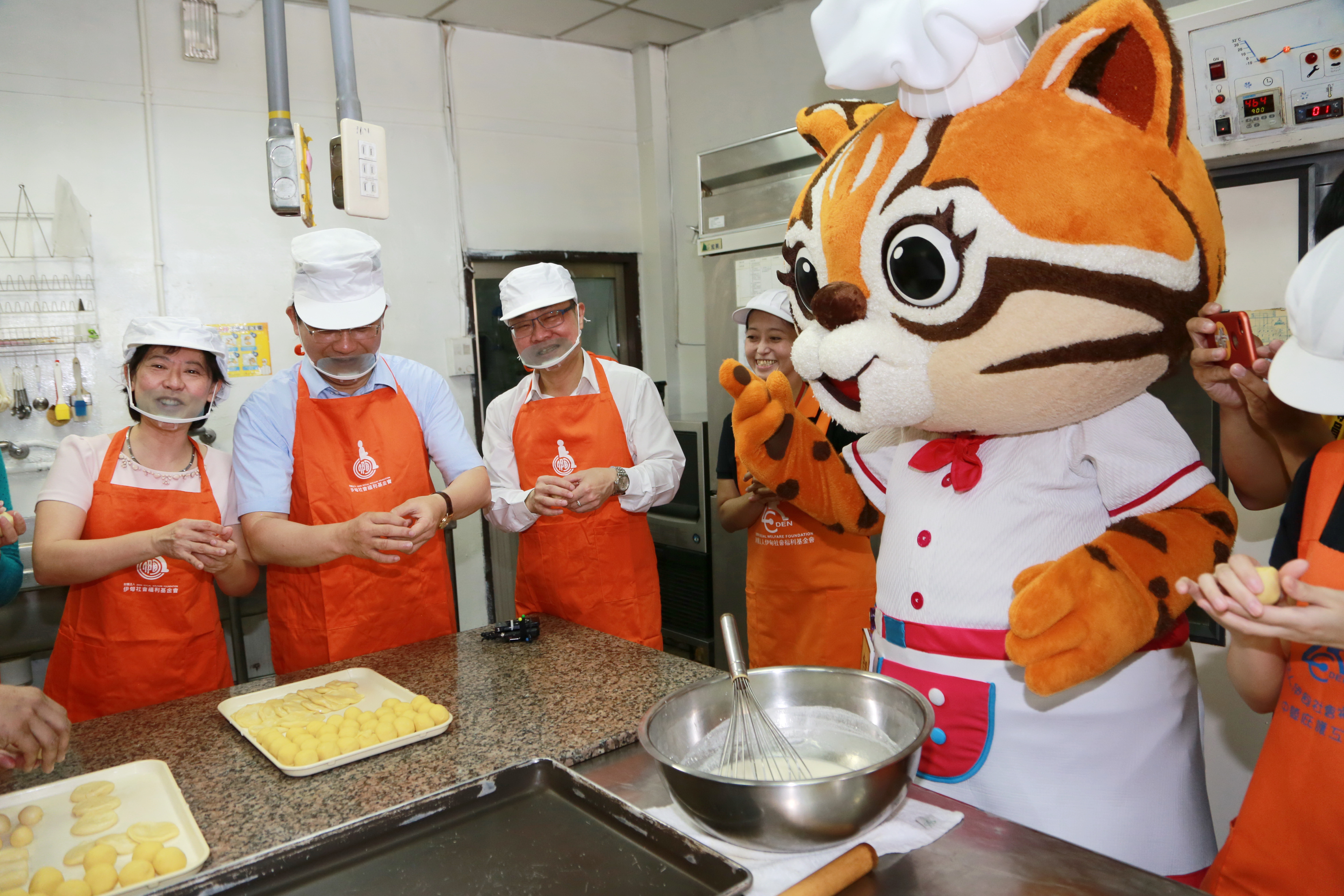 花博吉祥物「虎媽」今日首度在台中亮相,身為糕餅師傅的她,陪同林市長、市長夫人、社會局長呂建德、勞工局長黃荷婷一同前往潭子伊甸基金會身障庇護工場製作月餅;立委洪慈庸也前往共襄盛舉,為愛心月餅促銷。