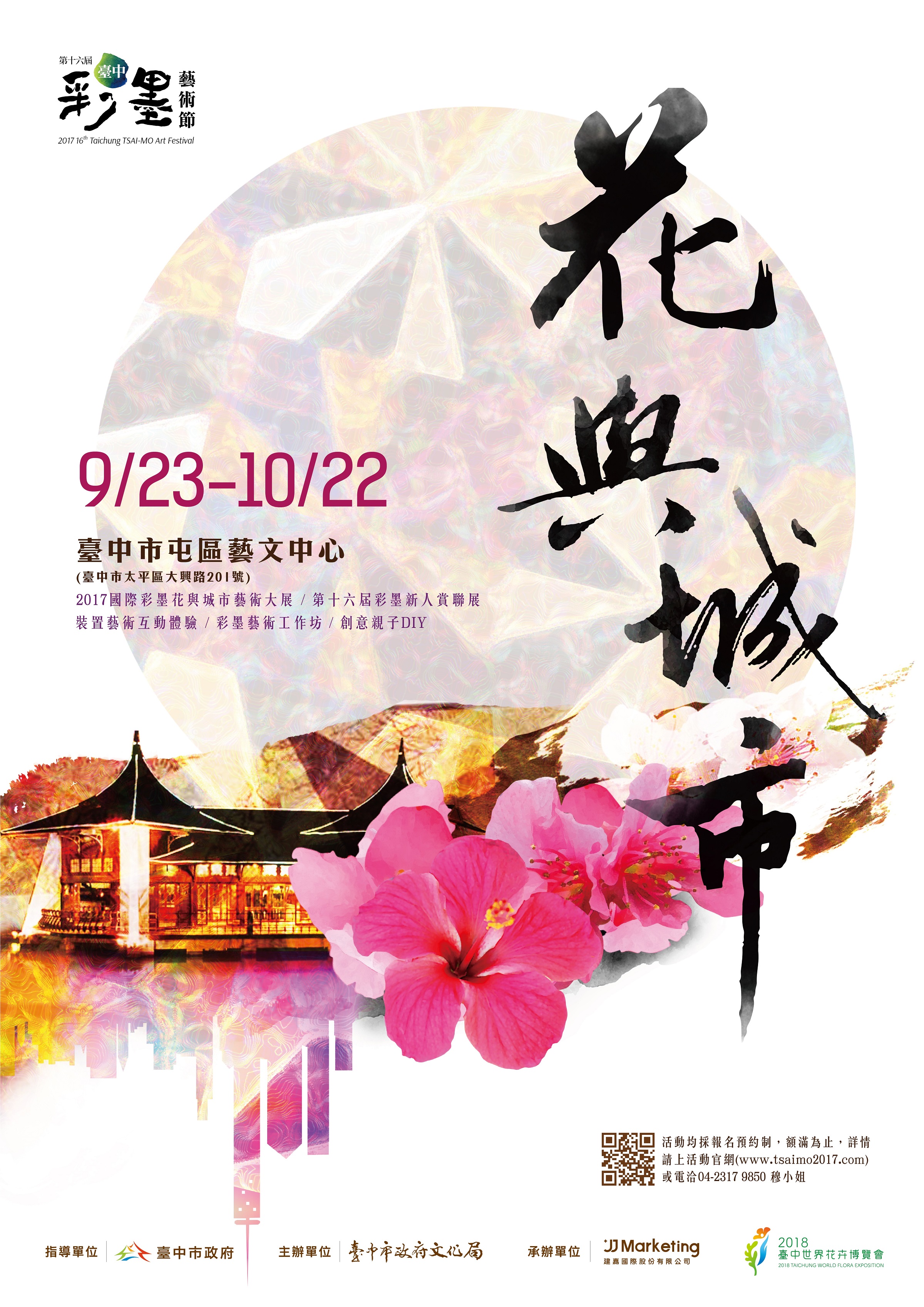 「2017第十六屆台中彩墨藝術節─花與城市」於9月23日至10月22日在屯區藝文中心盛大登場,為迎接2018台中世界花卉博覽會,今年活動特別以「花」為主題,整合國際彩墨花與城市藝術大展、第十六屆彩墨新人賞、裝置藝術互動體驗,並規劃彩墨工作坊及親子DIY,帶大家透過精彩畫作、動手做和走進大型裝置「萬花筒」,體驗彩墨的繽紛;而週六(23日)在葫蘆墩文化中心則有「花漾客家」音樂會,由靜宸合唱團徐麗紗教授企劃總籌,邀請老、中、青共十個合唱團齊聚一堂,用不同風格詮釋多首客家歌謠,活動免費索票入場,歡迎共襄盛舉!