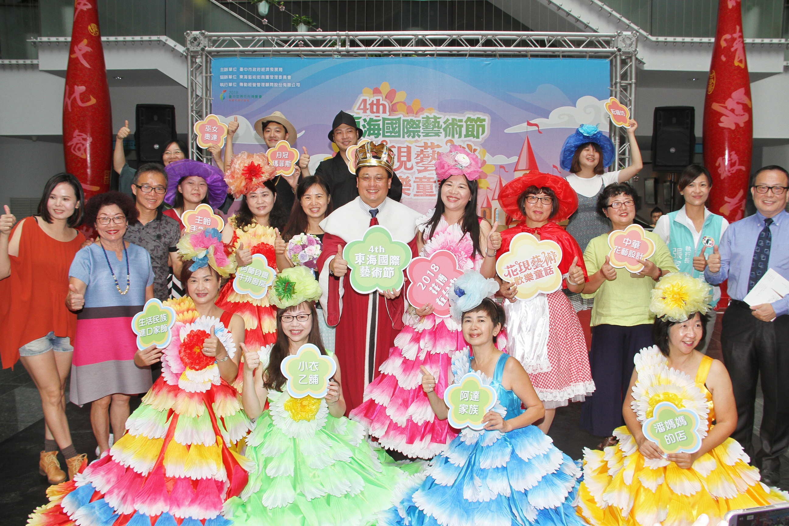 東海國際藝術節活動前記者會今(26)日在台中市政府市政大樓文心樓舉辦,來自東海商圈的8家店家業者,結合花博與童話元素,精心打扮成美麗公主,郭副秘書長也戴上王冠扮成童話故事中的國王,為商圈活動起跑暖身。