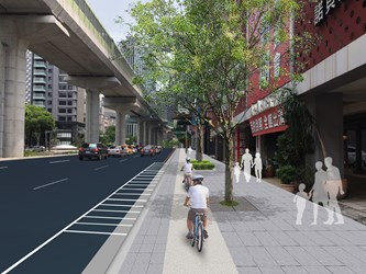 靠近馬路的人行道則規劃行人與自行車更寬廣的通行空間,將原本3公尺的人行道向外拓寬2公尺,其中的1.2公尺配置自行車及行人通行空間,以行人為優先,自行車併用、人車共道的方式規劃;其餘的0.8公尺則規劃緩衝帶於最外側,民眾在緩衝區間路邊停車開門,可提醒人行道上的自行車注意;同時,緩衝帶也可以作為公車候車區、無障礙及車行斜坡道設置空間。