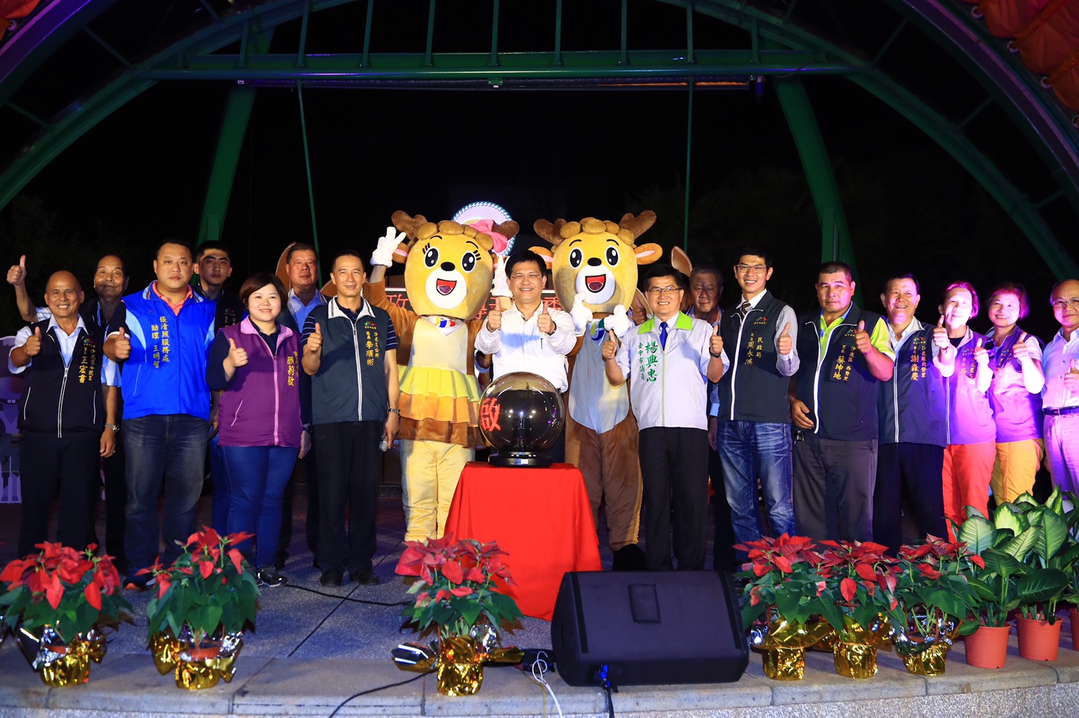 「2017沙鹿區『愛現沙鹿』舞台啟用典禮」今(30)晚登場,林市長與民政局長周永鴻、沙鹿區長李順彬、市議員楊典忠、顏莉敏、台中魚市場董事長陳寶禎、副議長張清照服務處代表等人,共同點燈啟用「愛現沙鹿」舞台。林市長並與現場民眾共同為沙鹿區吉祥物雙胞胎鹿命名。現場也安排海線社區大學「國際多元舞蹈班」及在地的「暗光鳥樂團」,帶來精采的舞蹈與薩克斯風演出。