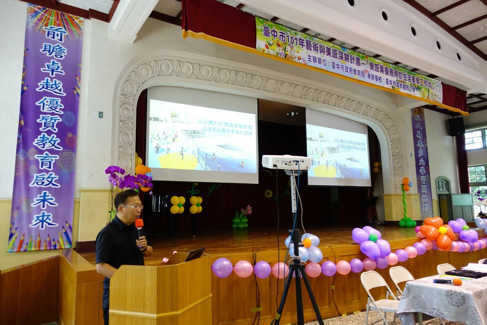 台中市政府教育局今(18)日在充滿建築美學的清水國小古蹟講堂舉行「美感素養應用於生活美學」工作坊,110位國高中及小學校長熱烈參與,邀請台中教育大學文化創意產業設計與營運學系教授顏名宏擔任講師,運用國內外案例及生活化的方式授課,期盼增進校園美感教育知能,進而推動美感空間營造。