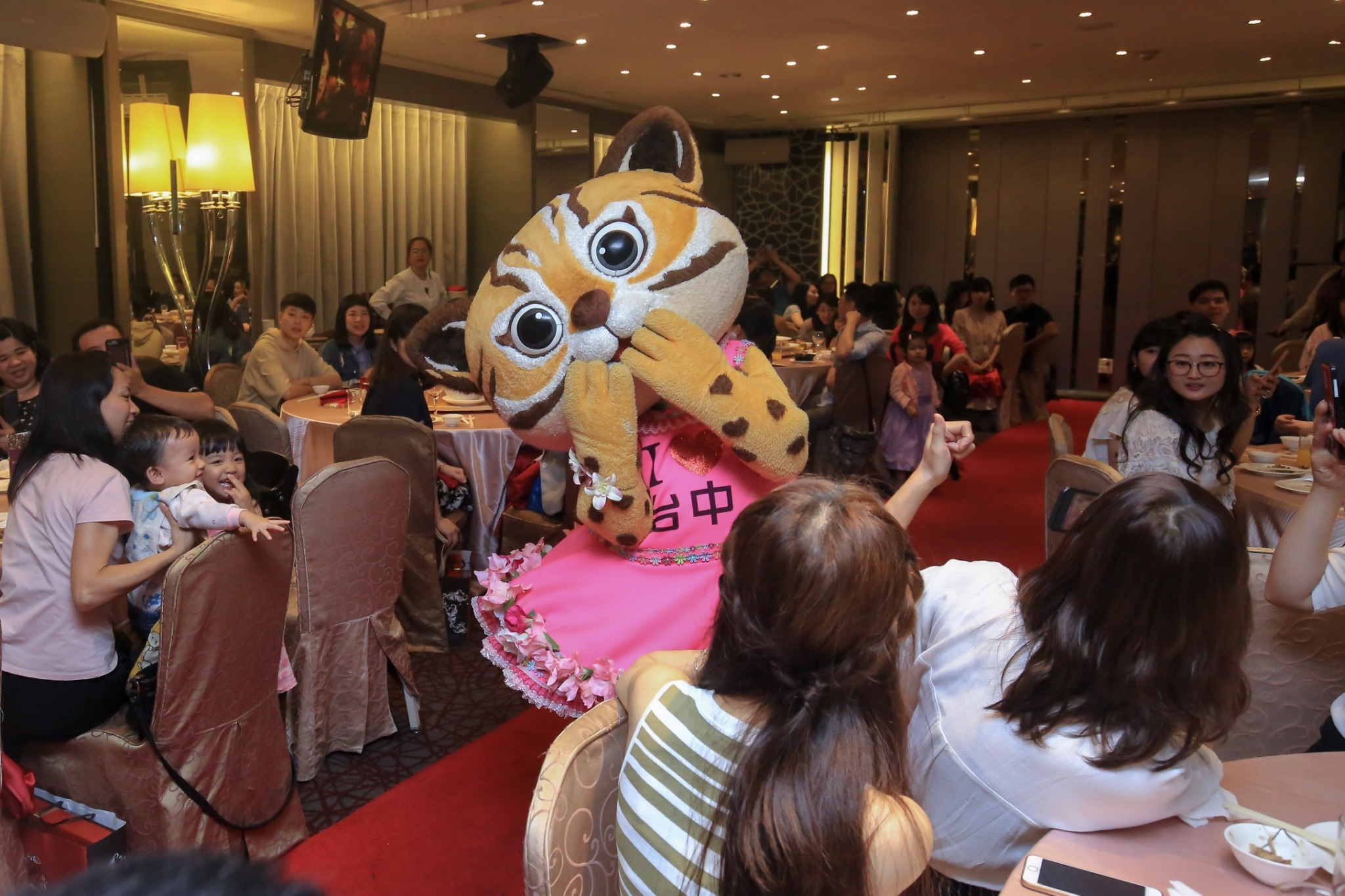 新人也邀請現場的小朋友,一起上台與來虎、樂虎合照,許多小朋友看到石虎家族便蜂擁上台,讓現場漫溢孩童的歡笑,最後來虎也將準備好的2張花博票券當做新婚禮物,邀請新人一起參與花博盛會。