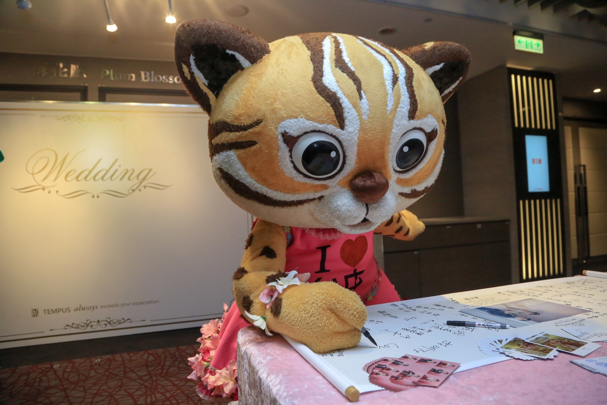 接著,在籌辦婚禮的過程和台中花博十分有緣份,像是結婚登記時,想挑選有漂亮背板的地方拍照,找了很久,最後是與神原先生到北區戶政事務所花博吉祥物背景前合影,留下人生重要的一刻,而且拍照起來的效果很好,後來在找婚宴場地時,也發現一到飯店就見到石虎家族一家人和歐米馬再向她招手,讓人十分開心,覺得結婚的過程一直有被石虎家族圍繞的感覺,因此特別想邀請他們出席自己的婚禮。