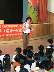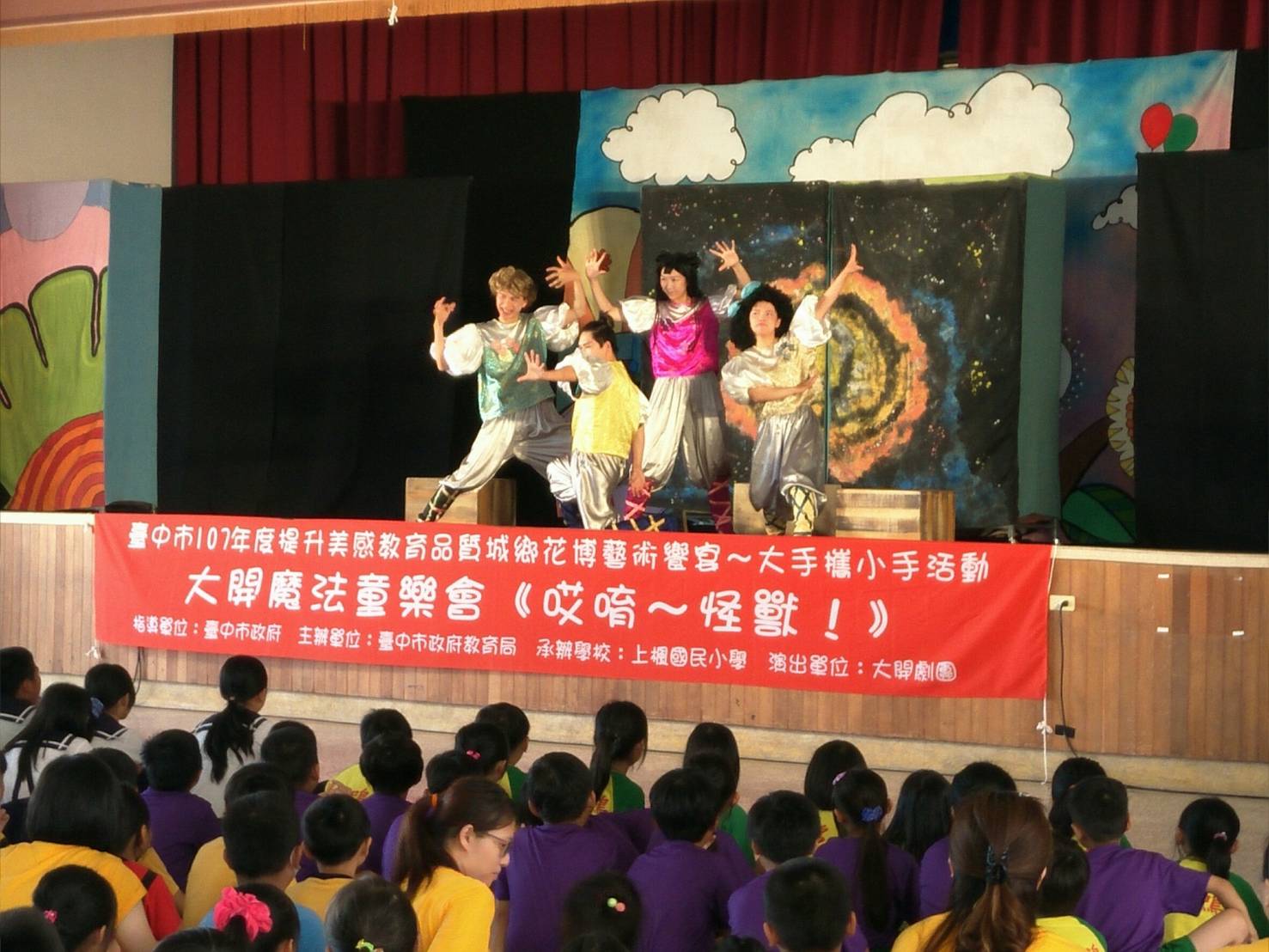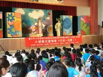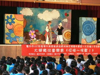 市府教育局舉辦「提升美感教育品質城鄉花博藝術饗宴~大手攜小手」展演活動,今(22)日入校巡迴首演在外埔區外埔國小登場,邀請鄰近區域4所小型學校師生約300多人參與,市長夫人廖婉如也前往現場與學生一起坐在舞台前,隨劇團說書人的引導,運用想像力,共同走進戲劇所營造出的敘事空間。