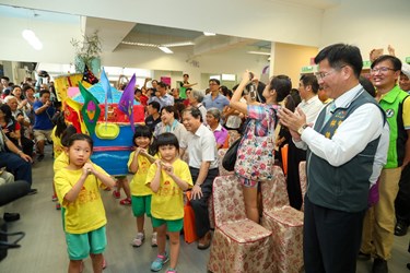 林市長今(24)日在文化局長王志誠、台中市立圖書館館長張曉玲、梧棲區長柯宏黛等人陪同下,出席梧棲分館重新開館儀式,包括市議員王立任、楊典忠、尤碧鈴及顏莉敏等人均到場共襄盛舉;現場由南簡社區樂齡阿公、阿嬤組成的「千歲團」陶笛、中正國小幼稚園帶來「梧棲走大轎」等表演,氣氛熱鬧。