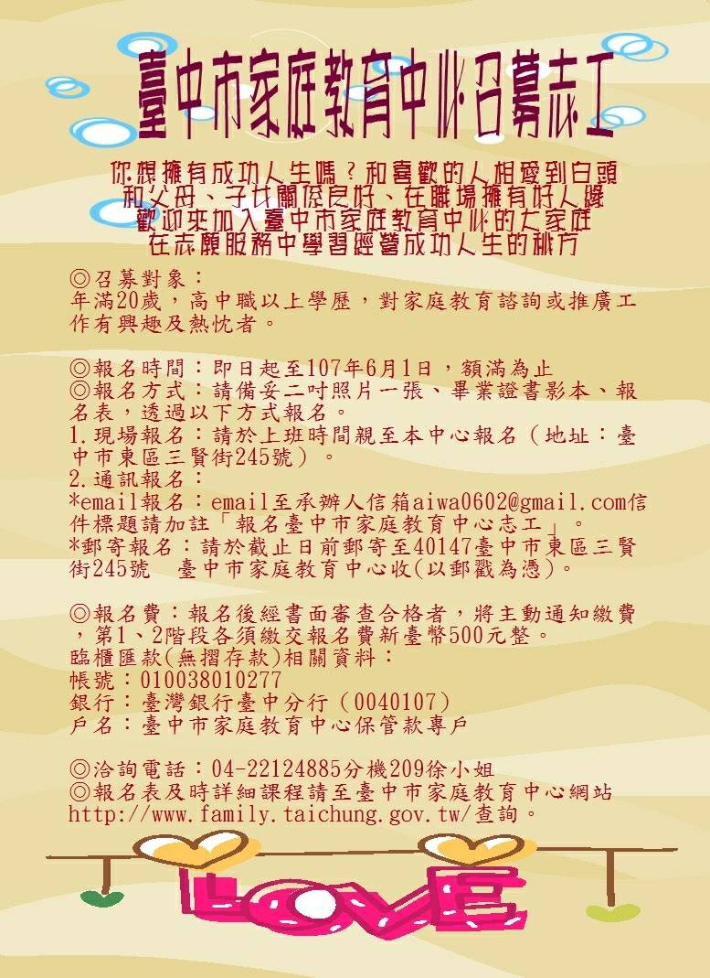台中市家庭教育中心志工招募即日開跑,志工服務內容包括舉辦家庭教育活動,以及諮詢專線、面談服務等,今年度培訓課程約3084小時,報名日期至61日止,歡迎踴躍參加。