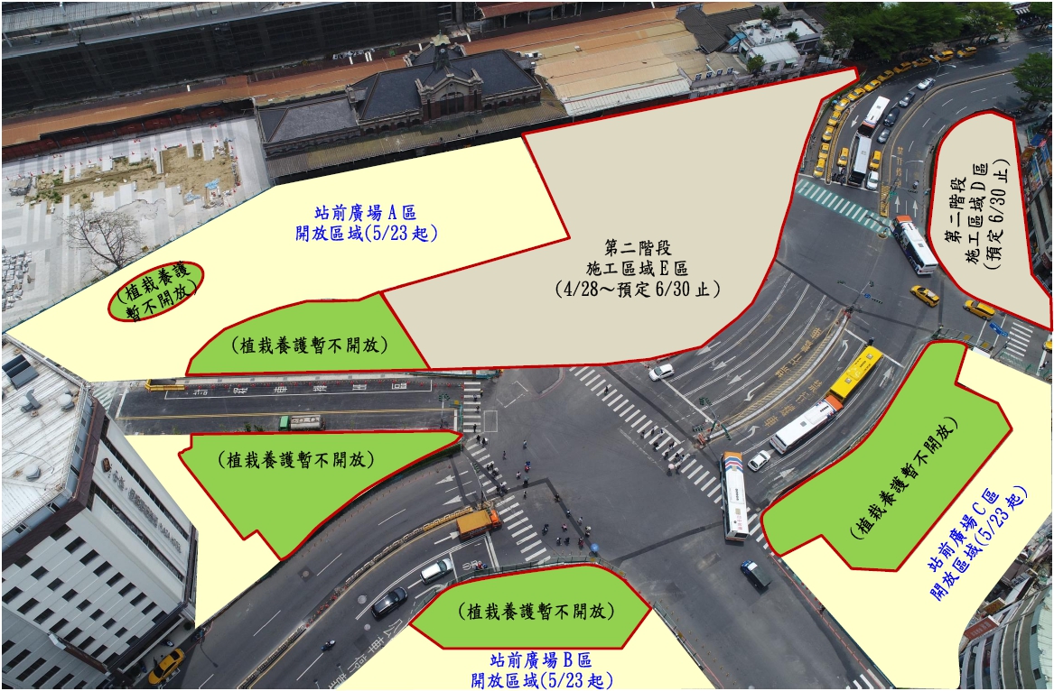 台中鐵路高架第一階段通車後,台中市政府推動台中車站廣場(廣6)工程,規劃廣場設置舖面、植栽綠化,進行周邊區域道路及人行道調整、無障礙通路設置等,今年1月15日開工,全區劃分A、B、C、D、E五個工區,採二階段施工;第一階段工區廣場已提前完工,即日起開放台灣大道兩側廣場及車站歷史建物前廣場供民眾通行。