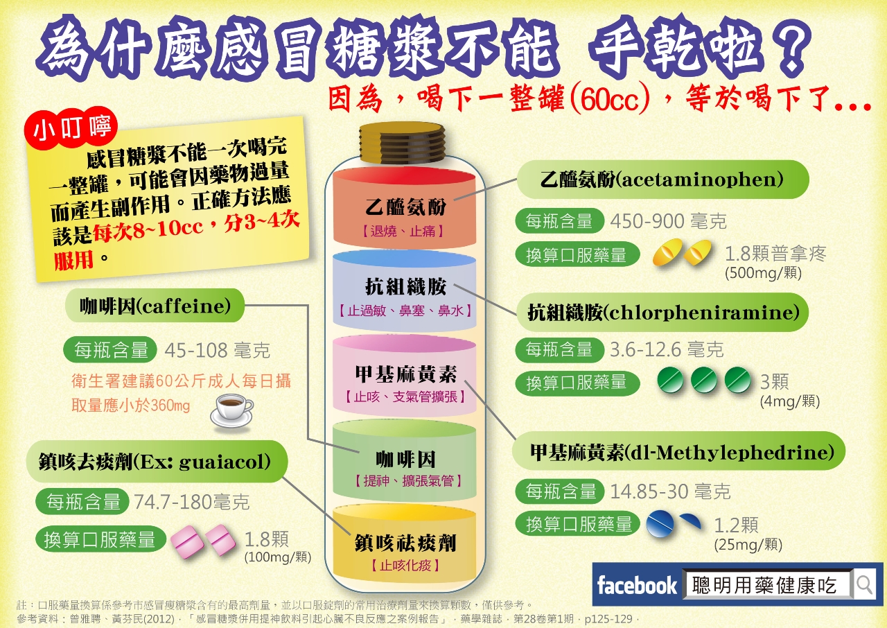有民眾一出現頭痛、流鼻水等感冒症狀,就會到藥局購買感冒藥水(指示藥)服用。台中市食安處表示,市面上常見的感冒糖漿,大多含有止痛、支氣管擴張、緩解咳嗽症狀及緩解流鼻水症狀、止咳的藥物成分,提醒務必遵照醫師與藥師指示,避免隨意喝下整瓶感冒糖漿,如有糖尿病、高血壓病史或操作危險機械族群,更應謹慎服用。