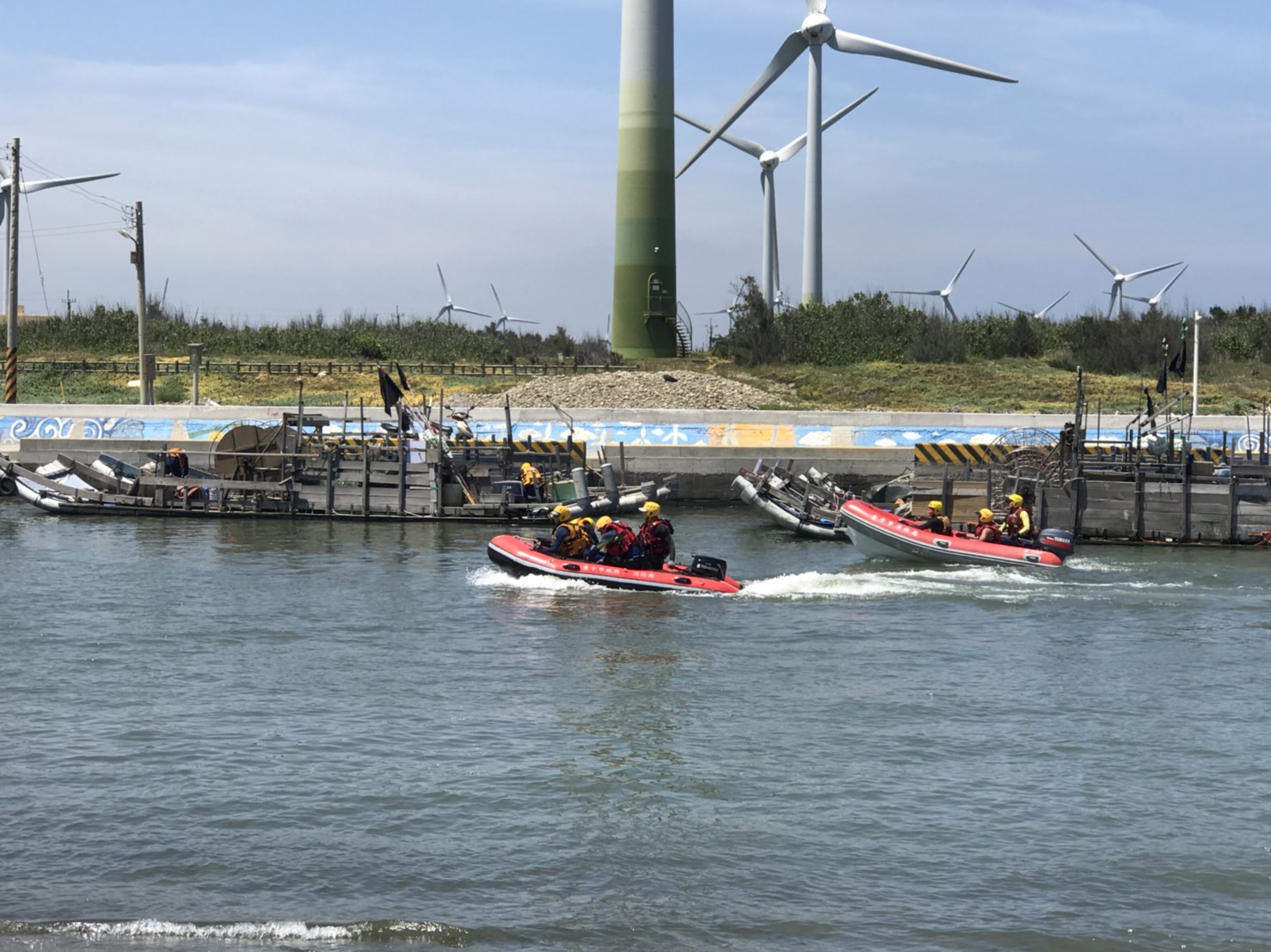 另外,今日現場也由消防局第五大隊、海巡署中部分署第三岸巡隊、松柏港船舶義消分隊、海龍救生義消分隊及三棲特搜義消分隊,進行水域救援演練,以提升防汛期間的水域救生技能,並培養團隊救生默契。