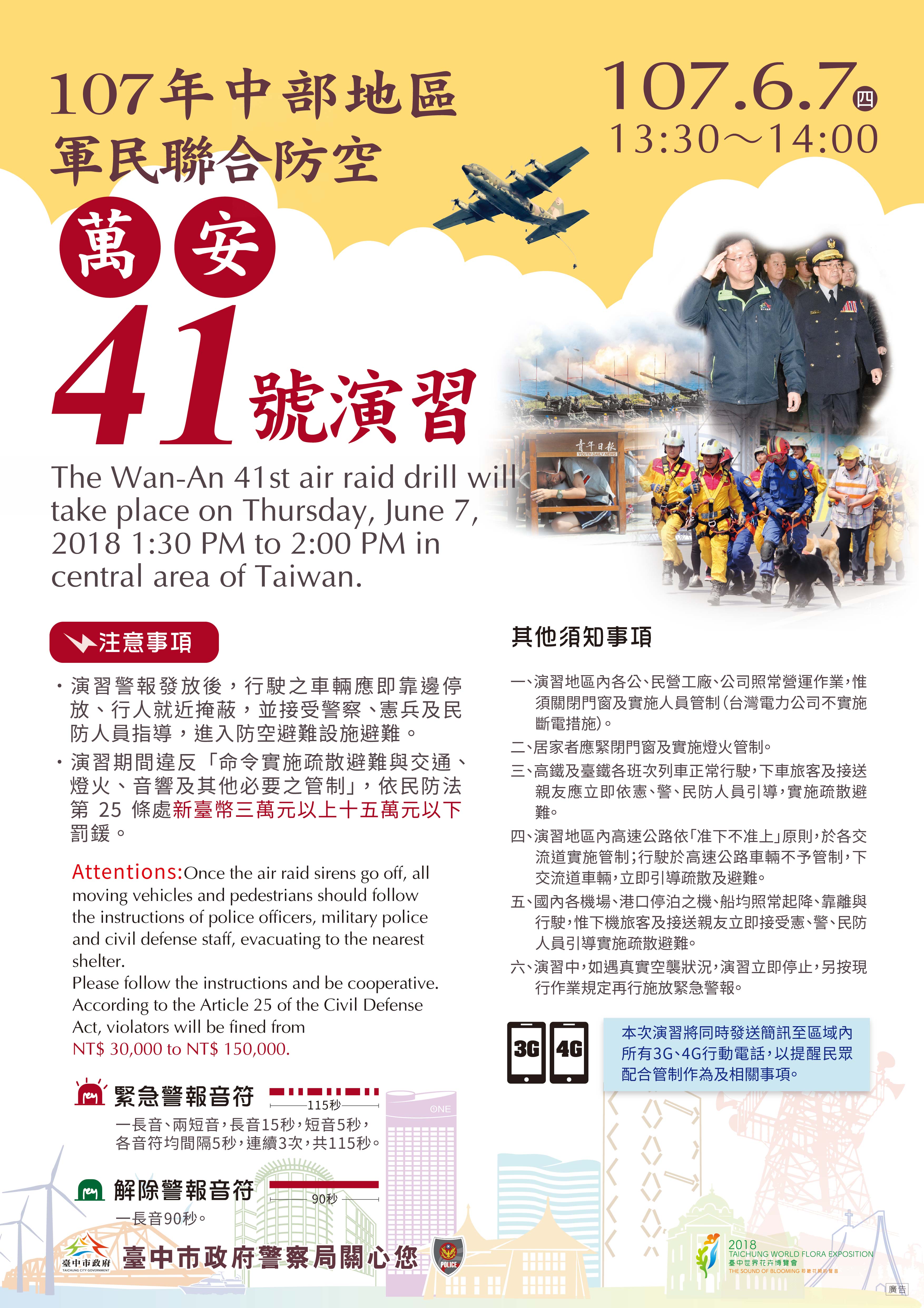 多一分準備、少一分災害!台中市107年災害防救演習及軍民聯合防空(萬安41號)演習將在6月7日登場,台中市政府提醒,萬安41號防空警報預定7日下午1時30分至2時發放,請全市所有部隊、機關、學校及民眾,應配合疏散避難。警察局表示,為加強宣導演習,今年特別製作英語、日語、越南語、印尼語及泰語等5國語言宣導單,讓外籍人士也能懂法令並配合管制。