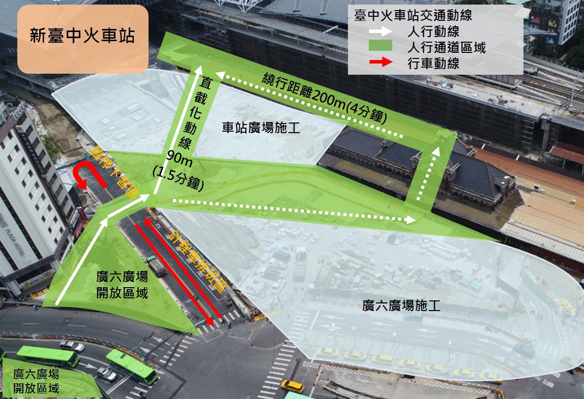 交通局長王義川表示,配合鐵路高架化工程,台中火車站正進行廣場景觀工程,由交通部鐵路改建工程局及台中市政府建設局分區域施工。原本行人須透過舊台中火車站進入新台中火車站,轉彎繞道長達200公尺,調整後可直接穿越鐵工局已完工區域直捷進入新站,站前廣場人行動線縮短至90公尺,同時也讓站前廣場人行通道維持最少5公尺,確保人潮眾多時不會推擠。