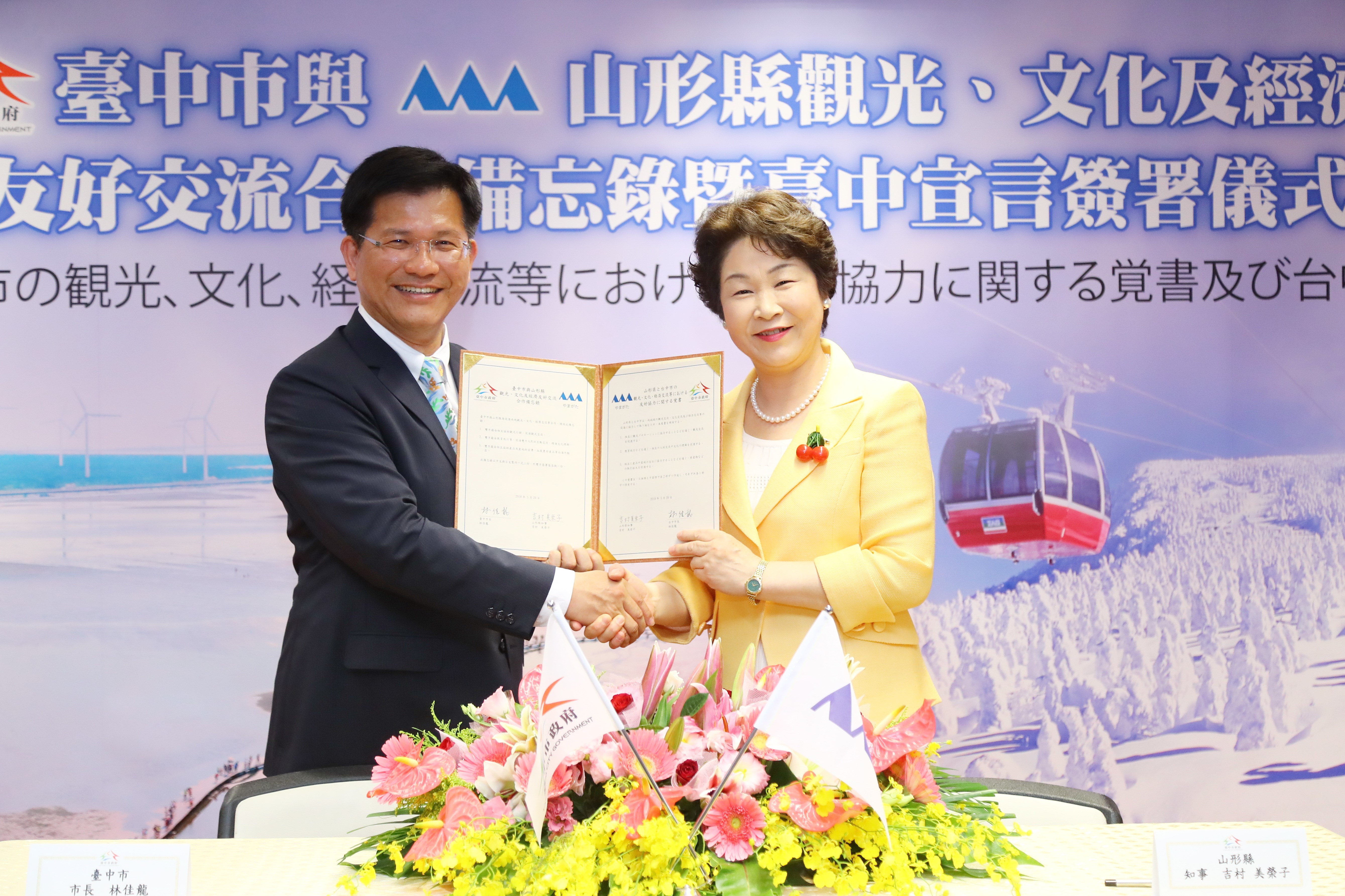 市府表示,近日林市長與日本山形縣知事吉村美榮子簽署「觀光、文化及經濟友好交流合作備忘錄」,締結友好城市,山形縣也響應花博與台中簽署「台中宣言」,深化雙方情誼;過去台中市也與日本其他城市,包括大分縣、群馬縣、愛媛縣、青森縣、青森縣平川市及廣島縣尾道市等互簽友好交流備忘錄,促進台中市與各城市間的交流。