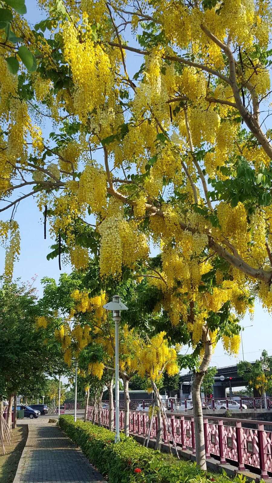 建設局表示,阿勃勒花期於每年5月到6月前後,一串串金黃色的小花掛在枝頭,伴隨微風搖曳,因此有「黃金雨」美名;大花紫薇花期則於每年6月至8月前後,美豔的紫色花朵引人注目,特別的是還會「變妝」,早上花瓣初開的時候是鮮紫色,中午變成玫瑰紅色,到了傍晚轉變為紫色。