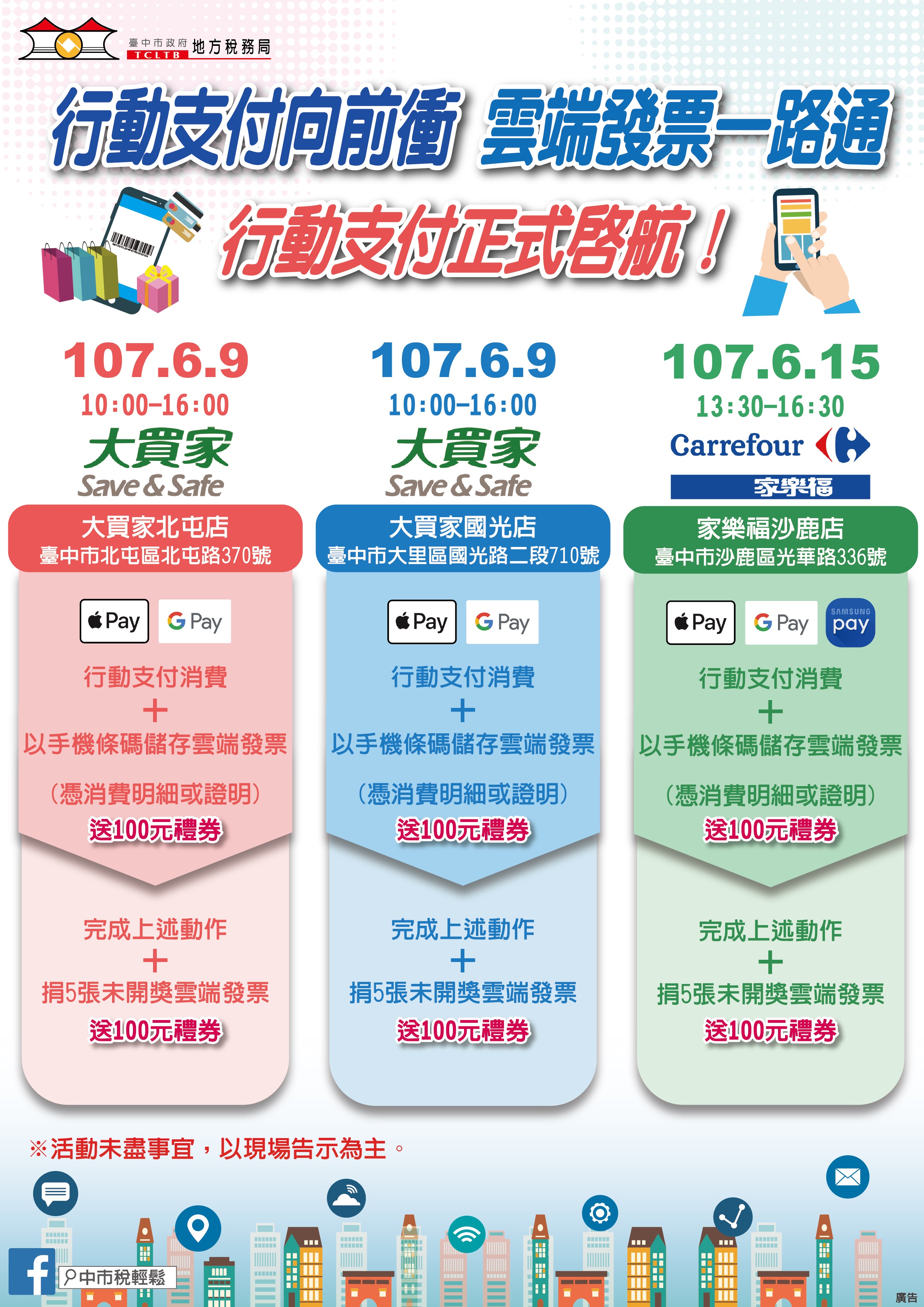 台中市政府地方稅務局結合家樂福、大買家舉辦消費體驗活動,9日在指定大買家門市、15日在指定家樂福門市使用行動支付消費,並以載具儲存雲端發票,至該局宣導攤位出示行動支付消費明細或證明,即可獲得100元禮券,每人限兌1次;若再捐贈5張每張付款金額5元(含)以上的未開獎雲端發票,再加碼贈送100元禮券,數量有限,送完為止,歡迎響應。