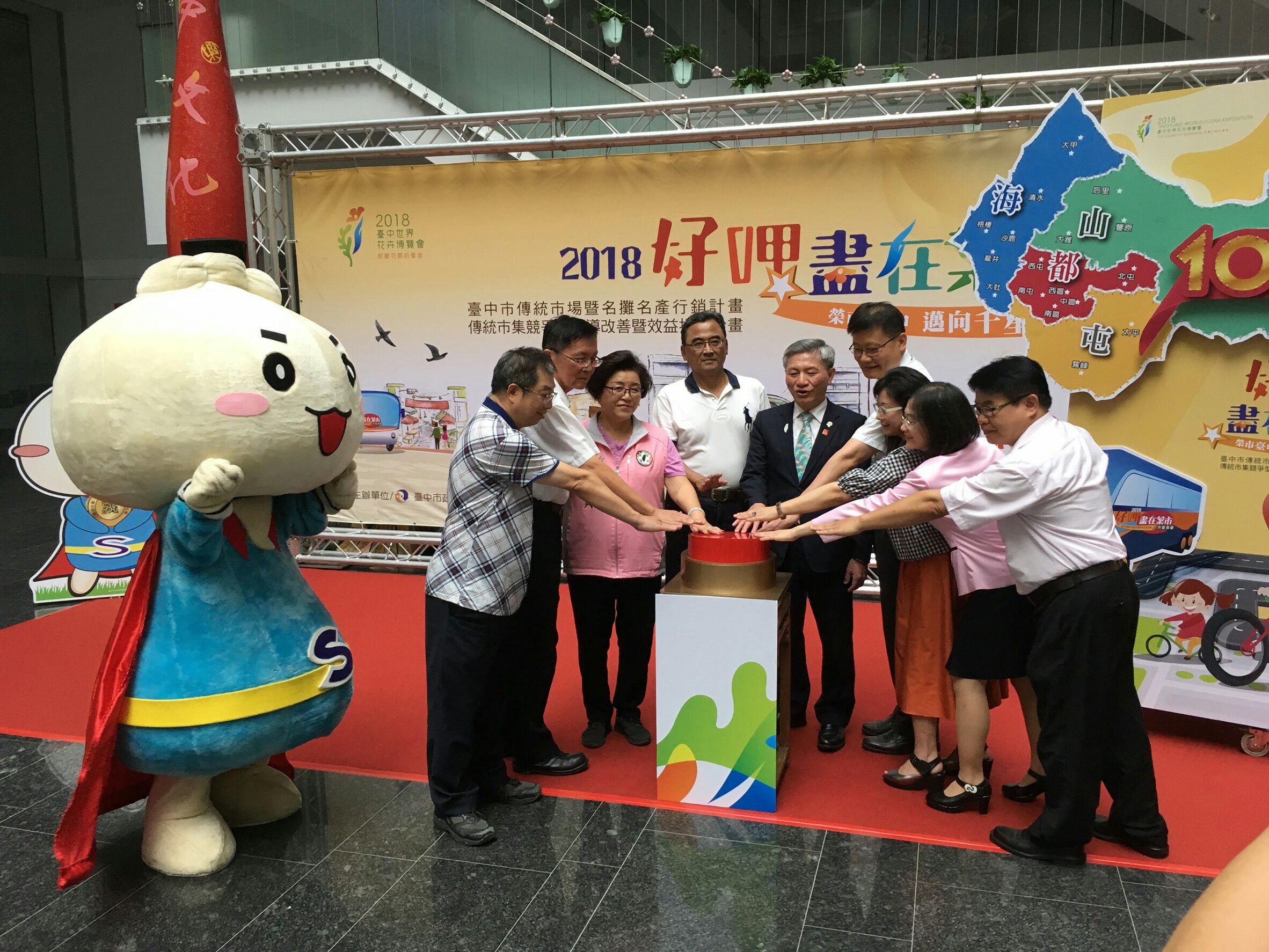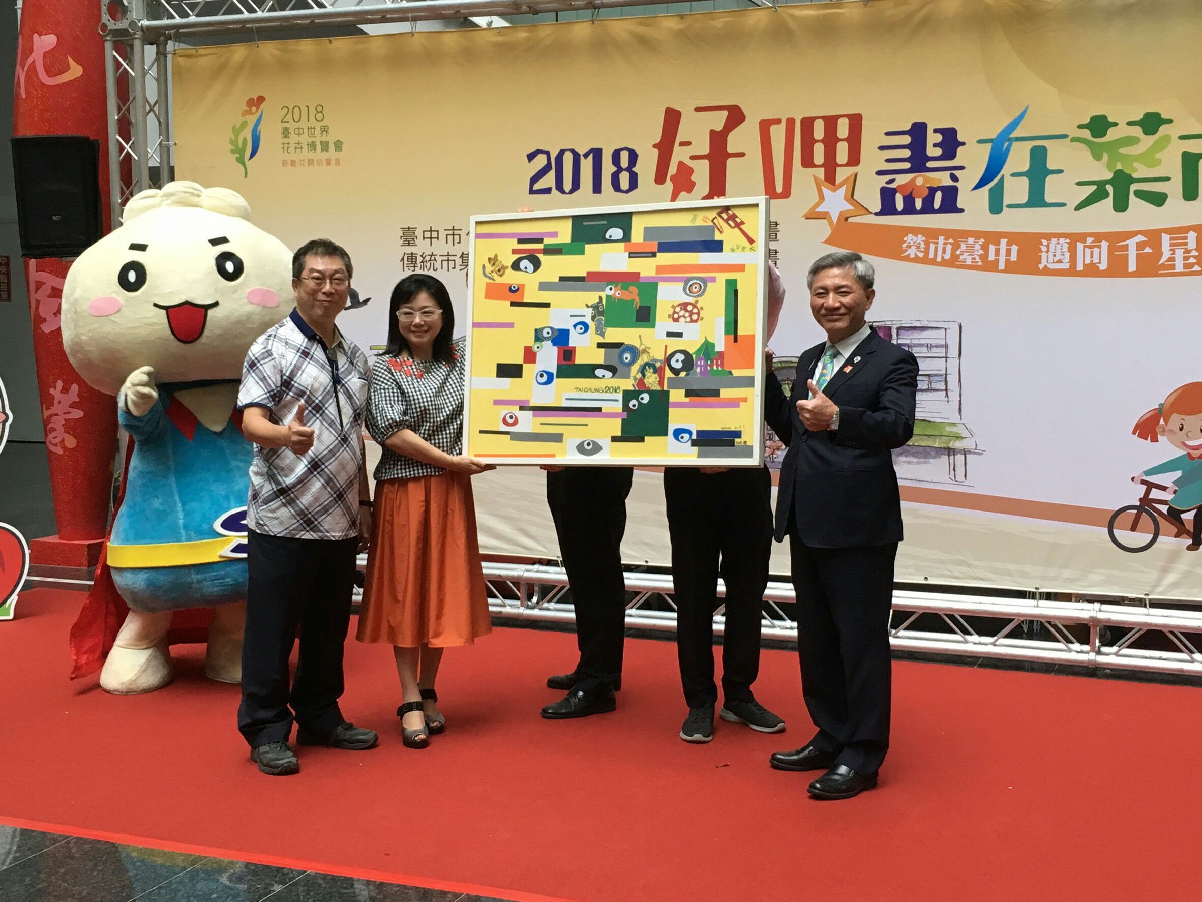 市府今日舉辦「榮市台中 邁向千星-2018市集名攤行銷輔導計畫啟動儀式記者會」,副市長張光瑤在人事處長陳杉根、經濟發展局副局長李逸安的陪同下出席,共同宣傳今年公有零售市場、攤販集中區傳統市集行銷與輔導計畫,並宣示107年台中市傳統市集獲得經濟部優良市集、樂活名攤評核獲獎總星數要突破千星的目標。漫畫家魚夫與建築師羅榮源與畫家謝碧芬均出席,並致贈市府傳統市集主題畫作,為傳統市集年度計畫與整體再生活化獻上祝福,市議員邱素貞也到場關心。
