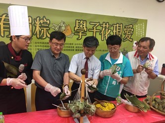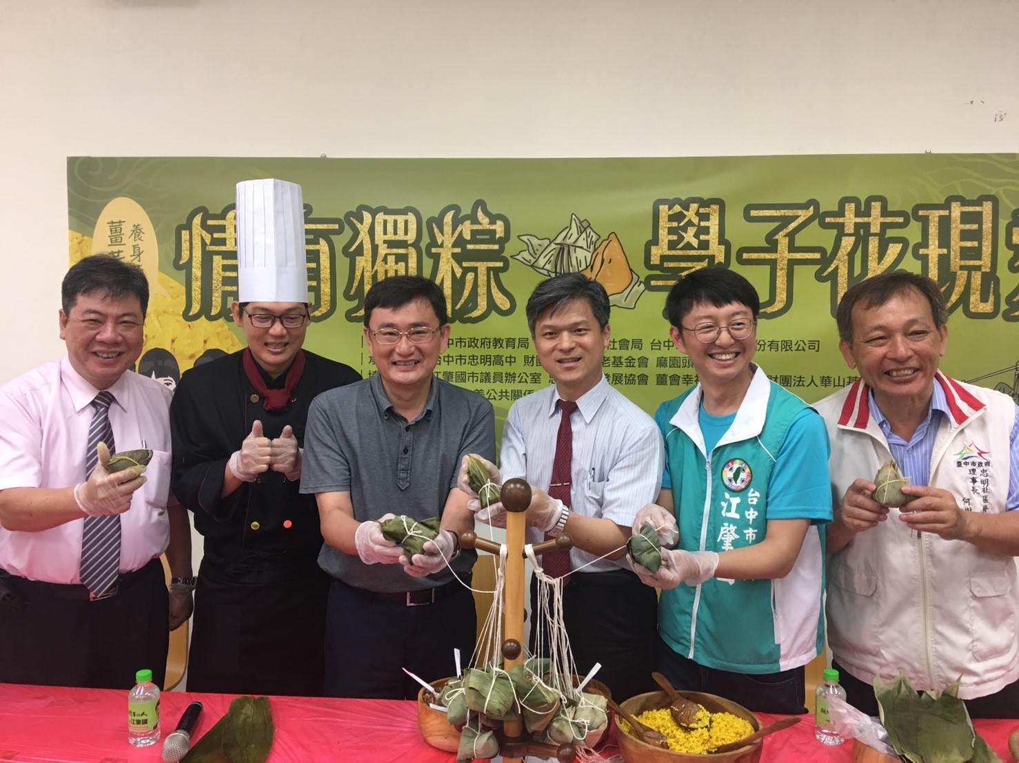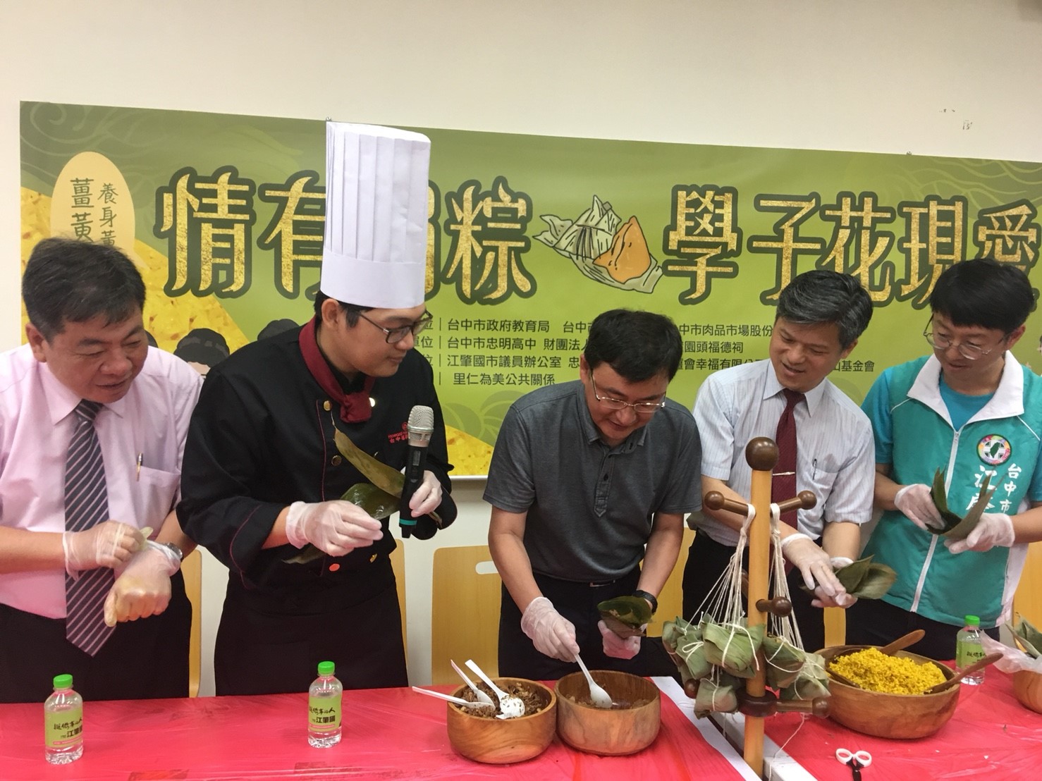 台中市政府教育局今(8)日在忠明高中舉辦包粽子活動,邀請台中饗宴館主廚親授養身黃金粽的餡料秘訣,由志工及學生共同為獨居長者包粽子,除讓年輕一輩學習傳統手藝外,也讓大家中分享關懷他人與付出的喜悅。