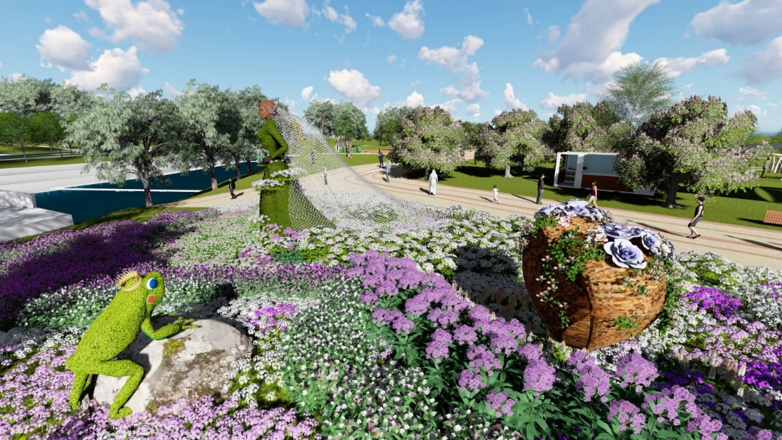 花博豐原葫蘆墩園區的「愛戀童話區」,搭配待嫁新娘雕塑,採用台灣優質當季花卉打造嫁紗花海,傳遞森林婚禮的幸福與花嫁意象,並在新娘旁以綠雕青蛙王子,訴說大家所熟悉的童話故事,盼讓每個人都發自內心喜悅,體現郭智鎧老師希望將花藝傳遞感動、幸福與愛的初衷。