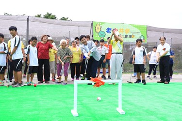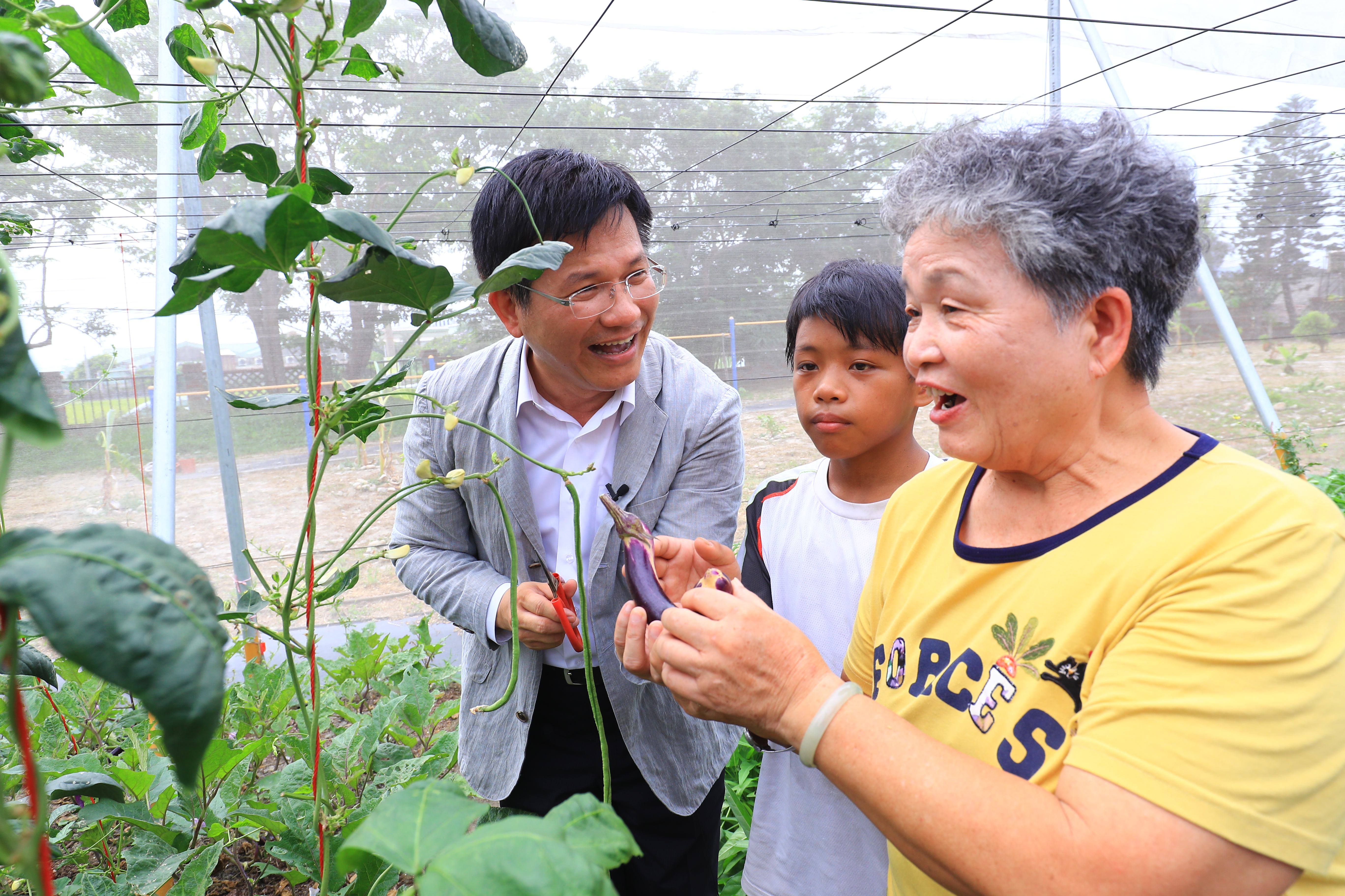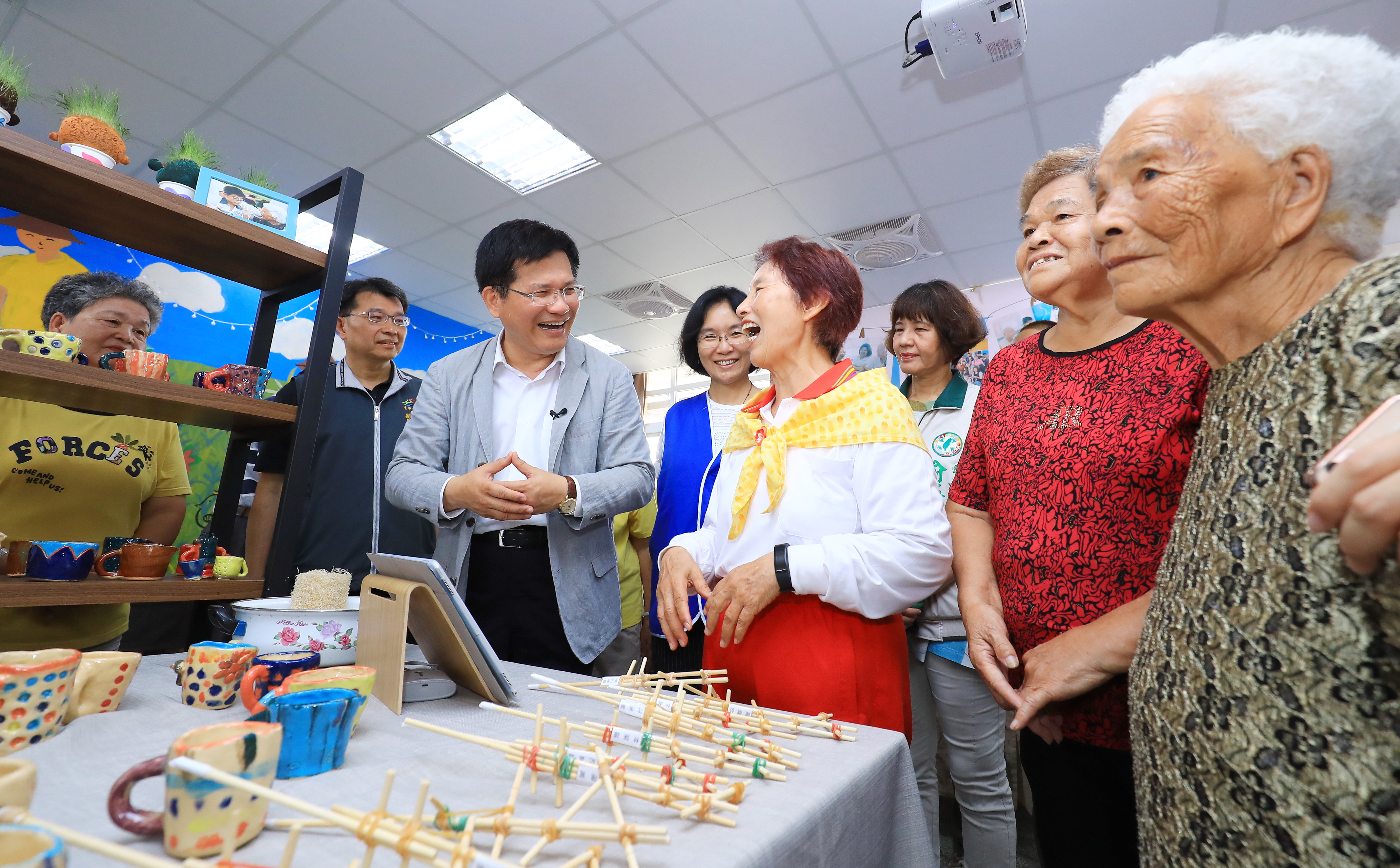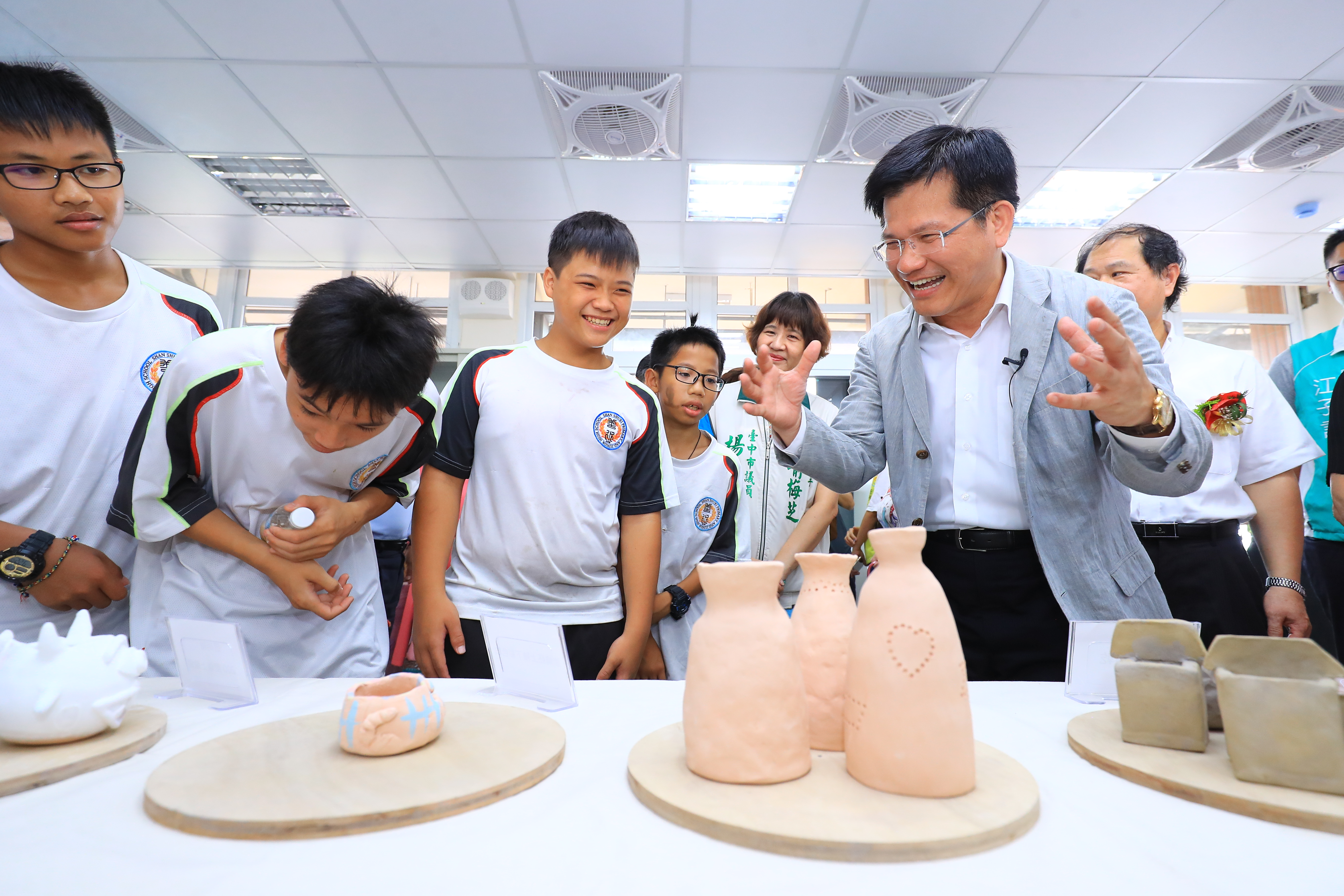 善水國民中小學「創校暨老少共學成果展演」活動,安排一系列學生及長青快樂學堂設計展演,包括老少共演宣導劇、老少共學槌球大賽等,展現年輕學子與長者共同學習的交流成果。林市長也在教育局長彭富源及善水國中小校長羅能熙陪同下,欣賞學生、長輩共同製作的花盆、筆筒、杯子、刀器等陶藝和木製作品,並參觀老少共同經營的開心農場,與長輩一起摘茄子等作物。學生和長輩們都開心解說自己的作品理念,現場氣氛歡樂。