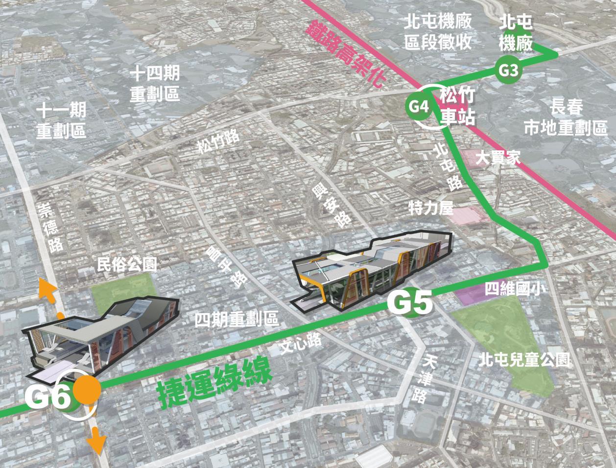 交通局也指出,隨著軌道工程完成,去年捷運綠線施工圍籬開始分段撤除,市府接續進行全線路平與人行道拓寬工程,讓文心路沿線有了嶄新的蛻變,其中,分別位於文心路四段與天津路四段、崇德路二段交叉口附近的G5、G6站, 由於位處捷運場站共構開發的核心區,使得周邊發展逐漸嶄露頭角,成為台中進入捷運時代後的明日之星。