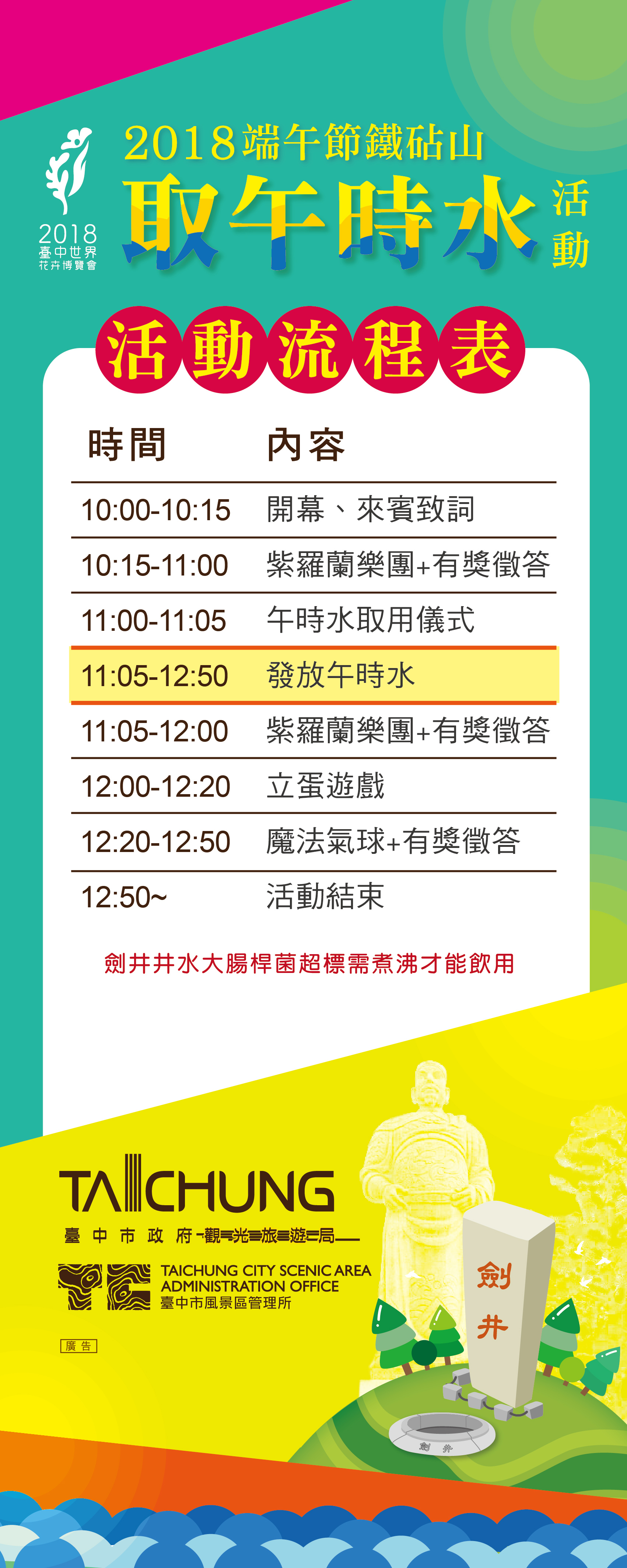 一年一度「2018端午節鐵砧山取午時水」將於18日上午10時將在劍井前廣場舉辦,安排有獎徵答,及午時立蛋小遊戲,為避免民眾搶水,台中市風景區管理所準備500份鐵砧山劍井紀念水瓶,並提醒民眾,活動之前為了清潔井體及辦理祈福儀式,劍井將封閉暫停使用,封井時間自今(15)日下午4時至18日上午11時。