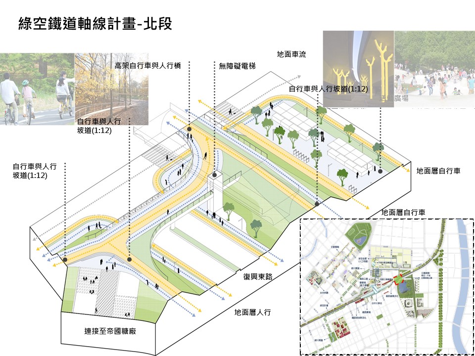 至於北段部分,除透過台中糖廠最北側到火車站的舊鐵道的騰空廊帶,加強設計人行及自行車系統外,都發局也與建設局整合施作自台中公園雙十路,南京路人本環境改善連結至舊火車站,再銜接至台糖湖濱生態公園,透過步道系統與北側空橋設置,串連糖廠與綠廊,已爭取到中央前瞻計畫核定規劃設計經費3千萬元,預計今年進行規劃設計,明年可開始施作,109年完工。