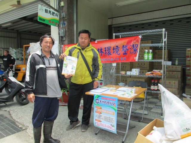 環保局表示,去年農藥容器兌換活動共回收約1,200公斤,成效良好。今年持續舉辦回收宣導活動,提醒農民農藥用畢後要「三沖三洗」,重複以水將農藥容器內的農藥沖洗,並將洗液倒入噴灑器中再利用,同時要將農藥容器的蓋子鎖緊,與其它資源回收物分開置放,並交由農會、清潔隊或農藥販賣業者進行定點回收,避免環境二次汙染。