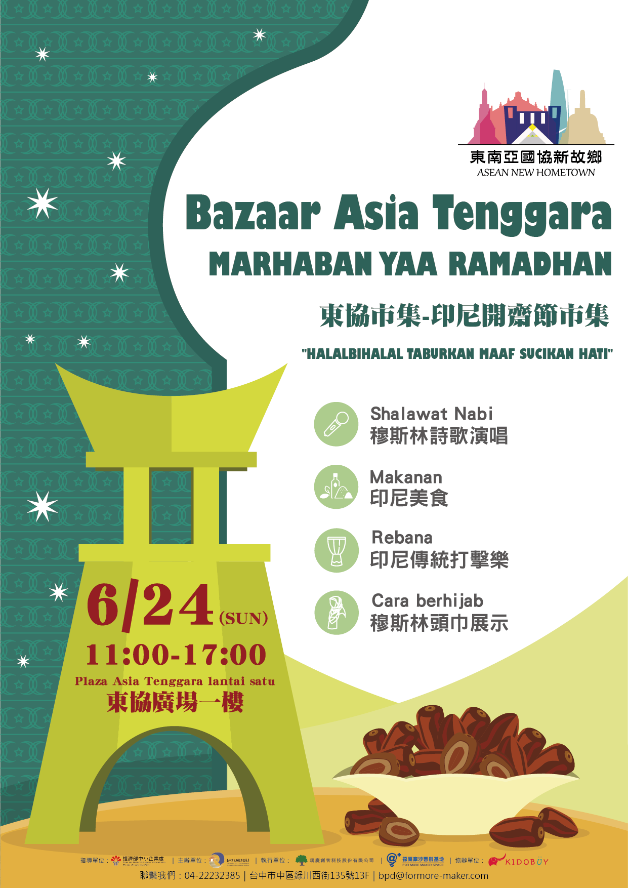 6月24日(星期日)上午11時在東協廣場一樓金字塔廣場,將有「東協市集-印尼開齋節」活動,現場有精采的印尼舞蹈演出,還安排穆斯林詩歌演唱、穆斯林頭巾穿著教學及印尼打擊樂表演炒熱現場氣氛;市集中亦將展售印尼特色小吃、穆斯林服飾、文創藝品以及台灣中部地區優質商品。本週還有不少展覽、演講等活動,更多資訊,請見「中市週末活動看板0623_0624」。(6/22*6)*新聞局