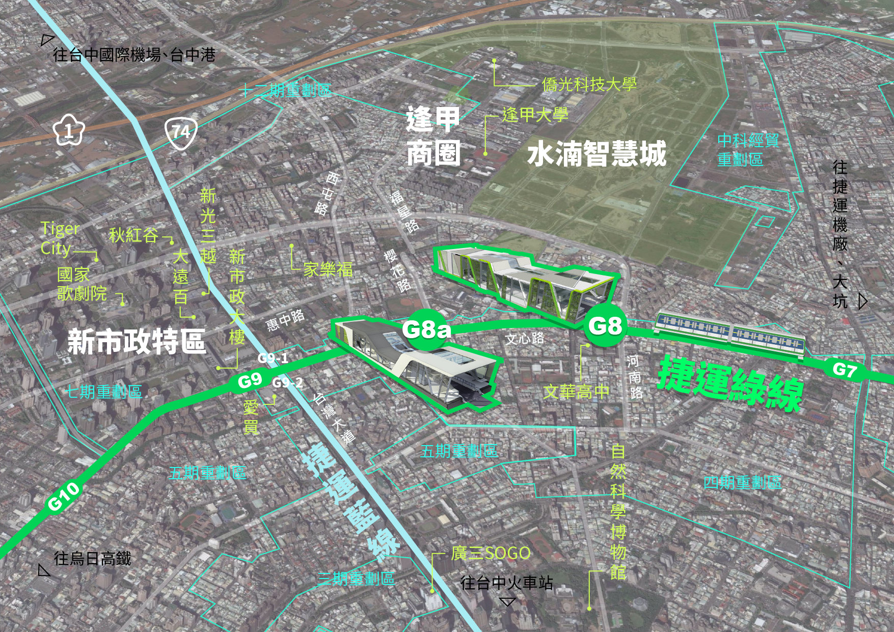 交通局表示,捷運綠線G8及G8a兩站分別位於文心路與河南路、櫻花路交叉路口附近,居中各開發區交界的核心位置,東有科博館、西有秋紅谷與朝馬轉運站、南有新市政中心、北有逢甲夜市及水湳經貿園區,毗鄰台中市精華地帶。