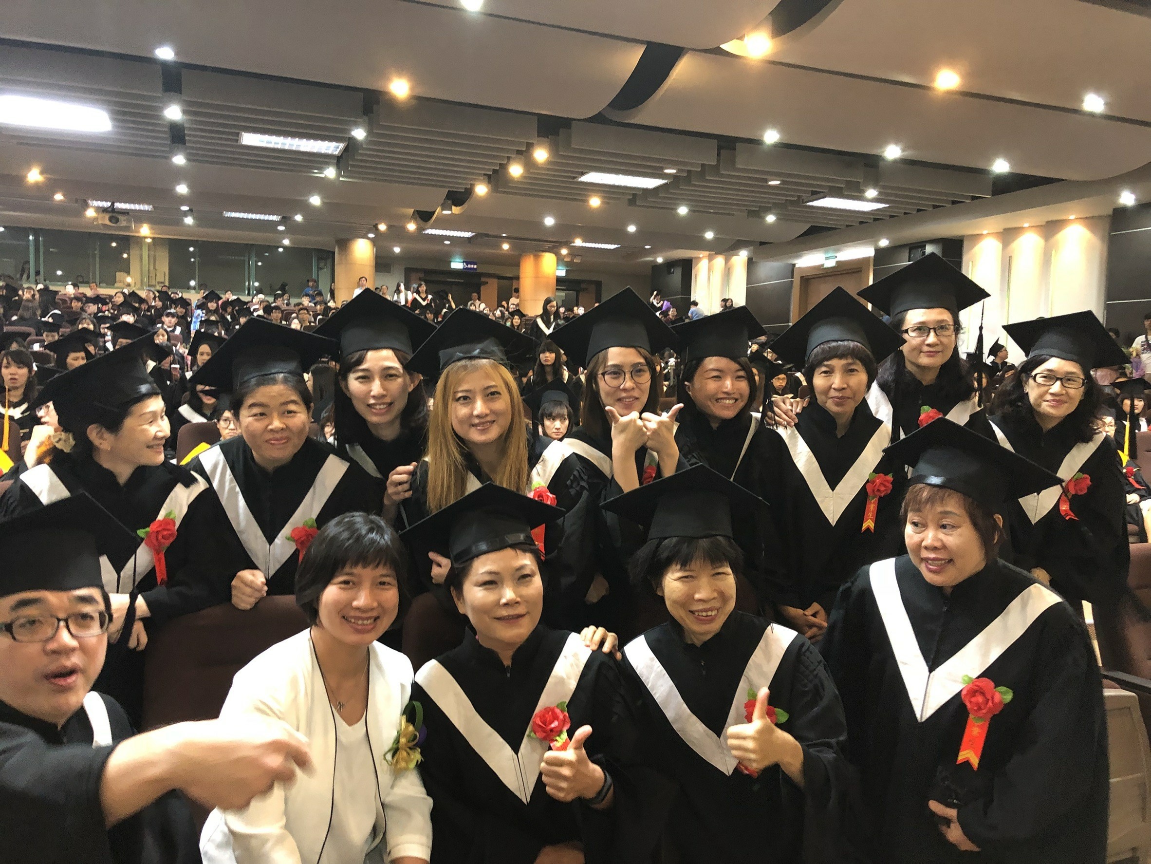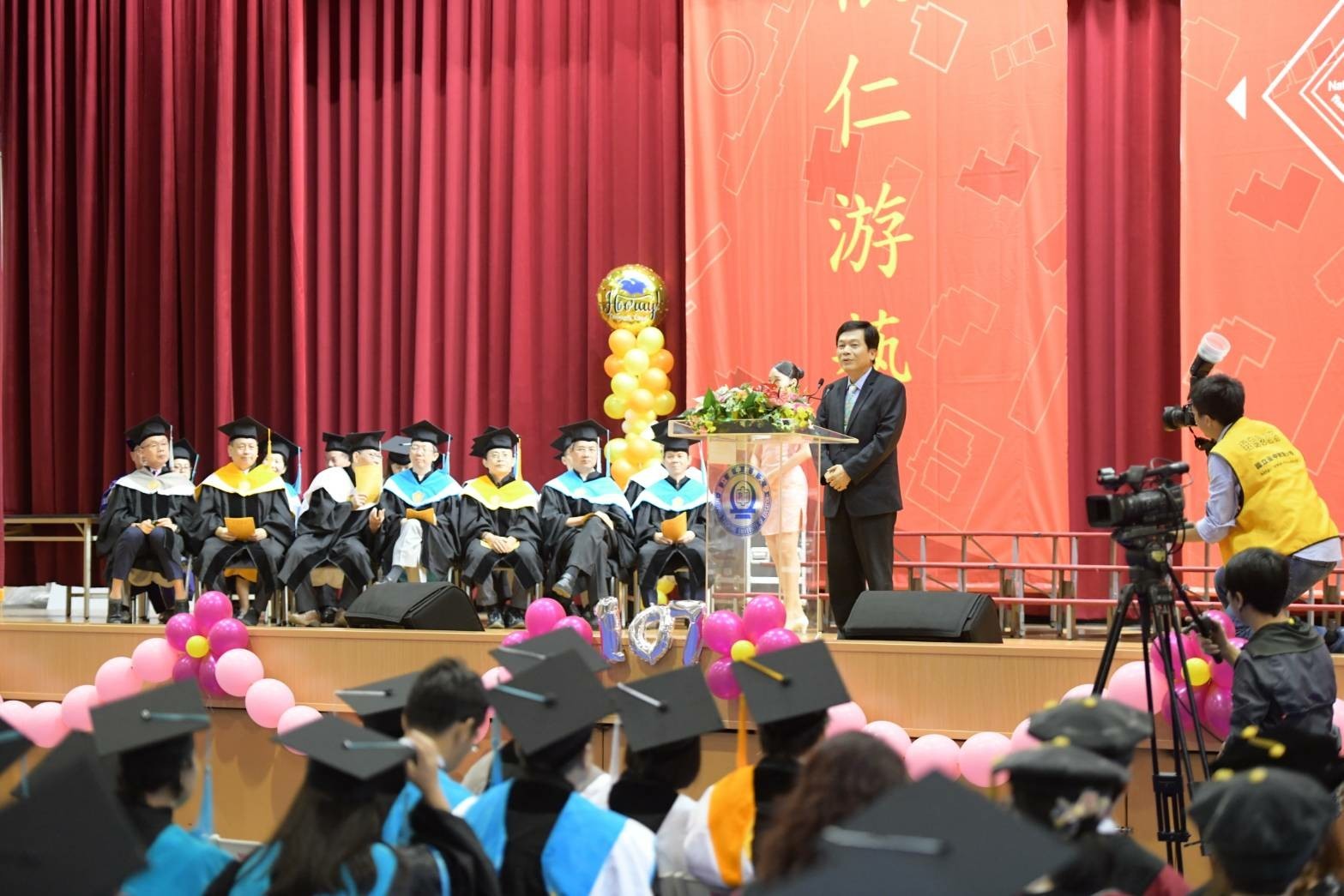 中台科技大學畢業典禮除了全程現場直播,並為畢業生準備打卡小道具,提供拍照留念,讓學生透過臉書、IG即時分享畢業喜訊,現場吸引許多學生搶拍打卡。包括林副市長、中台科大校長李隆盛、董事長暨校友李沛霖、李綜合醫院董事長李順安、台灣精準醫療品質策進會理事長張珩等人都到場共襄盛舉。