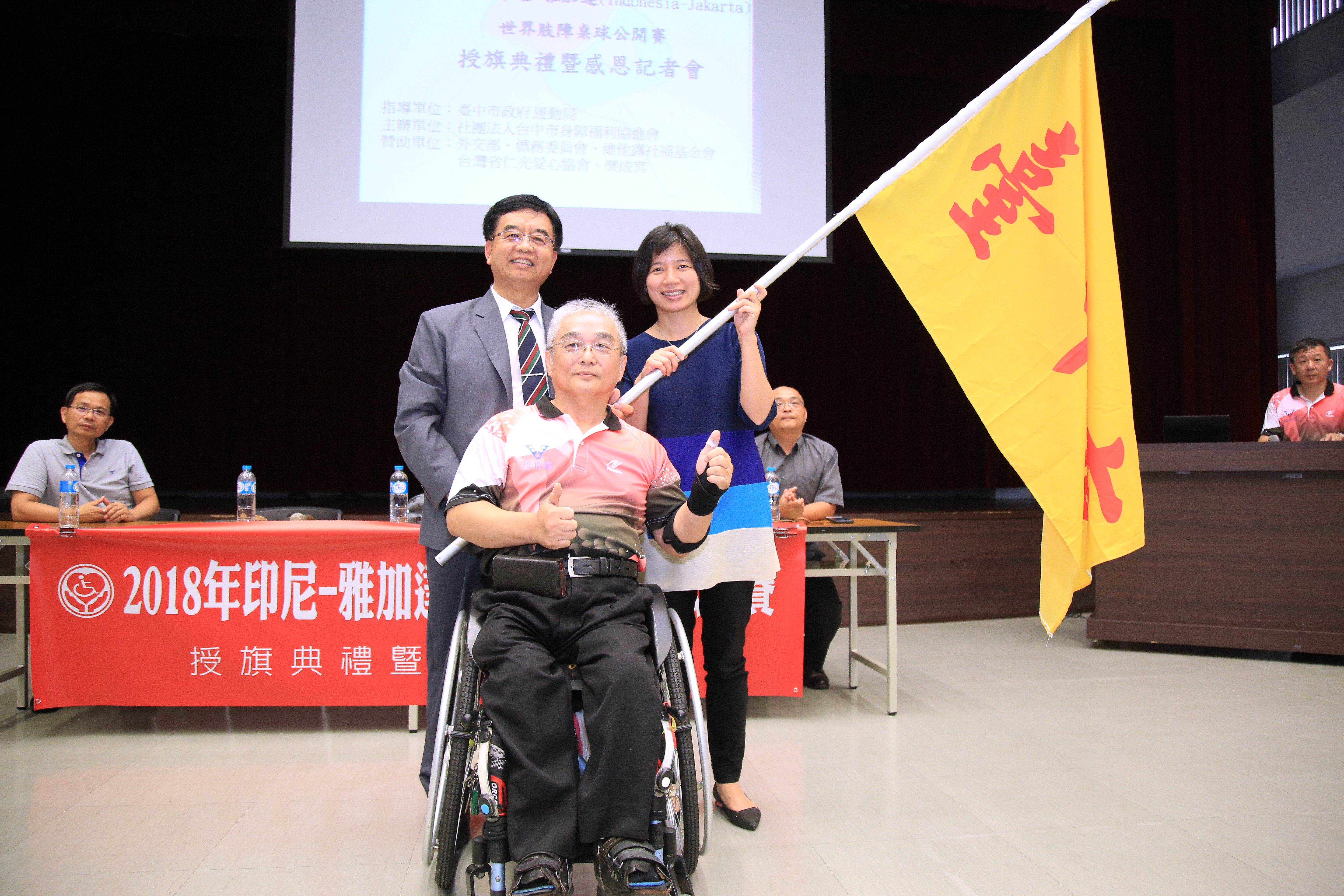 台中市身障者組成的中福維他露桌球隊,今年派出11名選手及2名隊職員,629日將赴印尼雅加達參加世界肢障桌球公開賽,預計76日回台,這次參賽除爭取獎牌及吸收經驗外,並培訓2018世界盃身心障礙桌球錦標賽國手,作為2019亞洲盃身心障礙桌球錦標賽、2020年東京帕運身心障礙桌球錦標賽的前哨賽事。副市長林依瑩今(25)日授旗給台中市身障福利協進會理事長黃麒麟,為選手加油,預祝旗開得勝。