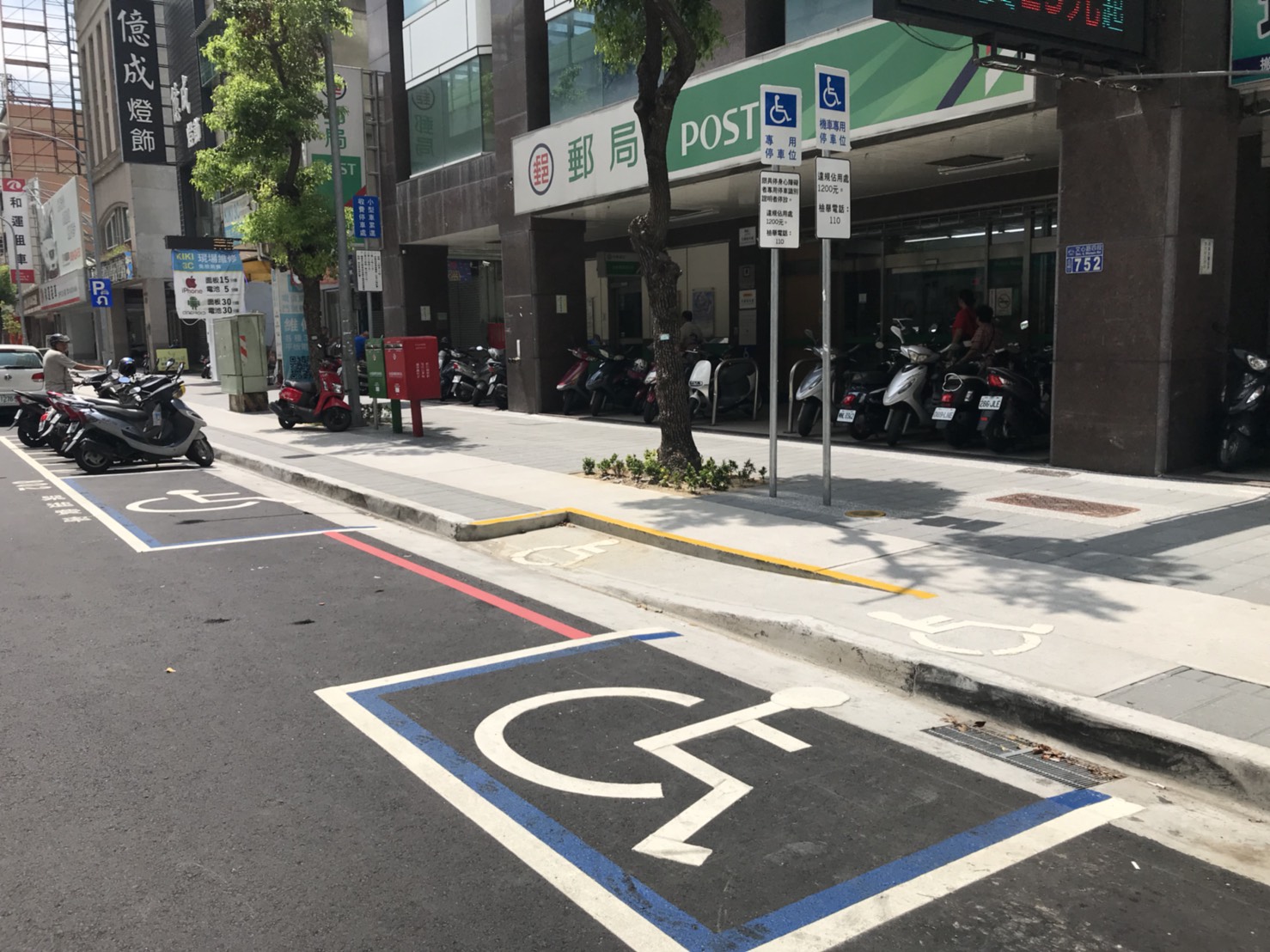 建設局指出,配合無障礙停車位及反向式公車候車亭設計,也設置「路側無障礙斜坡」,斜坡分為三段緩衝,坡度高度比例為1比12、坡幅8.33%,坡長至少1.8公尺,均符合「市區道路及附屬工程設計規範」規定,共設置134處。道路側下平台寬度及左右各1公尺也繪設紅線,避免車輛停放影響身障者停車通行空間。