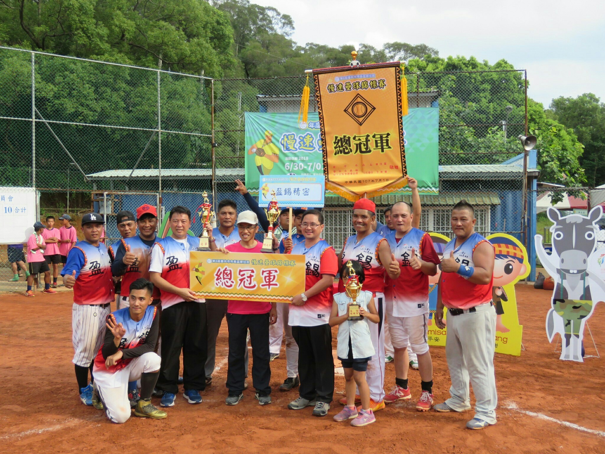 台中第8屆市長盃原住民慢速壘球錦標賽日前圓滿落幕,台中市「盈錫精密」慢壘隊以2比1擊敗來自彰化縣的POWER隊,將總冠軍留在台中。台中市政府原民會主委全秋雄表示,每支隊伍都拿出最好的實力並展現運動家精神,盼藉由比賽鼓勵更多原住民族人養成運動習慣,讓身心良好發展。