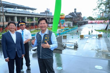 林市長表示,台中火車站不但有第三代的高架鐵路,也保留第二代國定古蹟車站,甚至在車站改建過程中,挖掘到埋在地下的第一代日治時期車站的車庫。台中是因為鐵道而誕生的城市,站前廣場可說是台中市座標原點,市府從交通部鐵工局承接下站前廣場整建工程後,盡全力趕工,在短短165天完工啟用,比鐵改局預計的480天還少了315天,非常不容易;在整建過程中,市府一方面希望存舊立新,並成為市民空間,因此工程團隊盡力保留舊車站,也已達成目標。