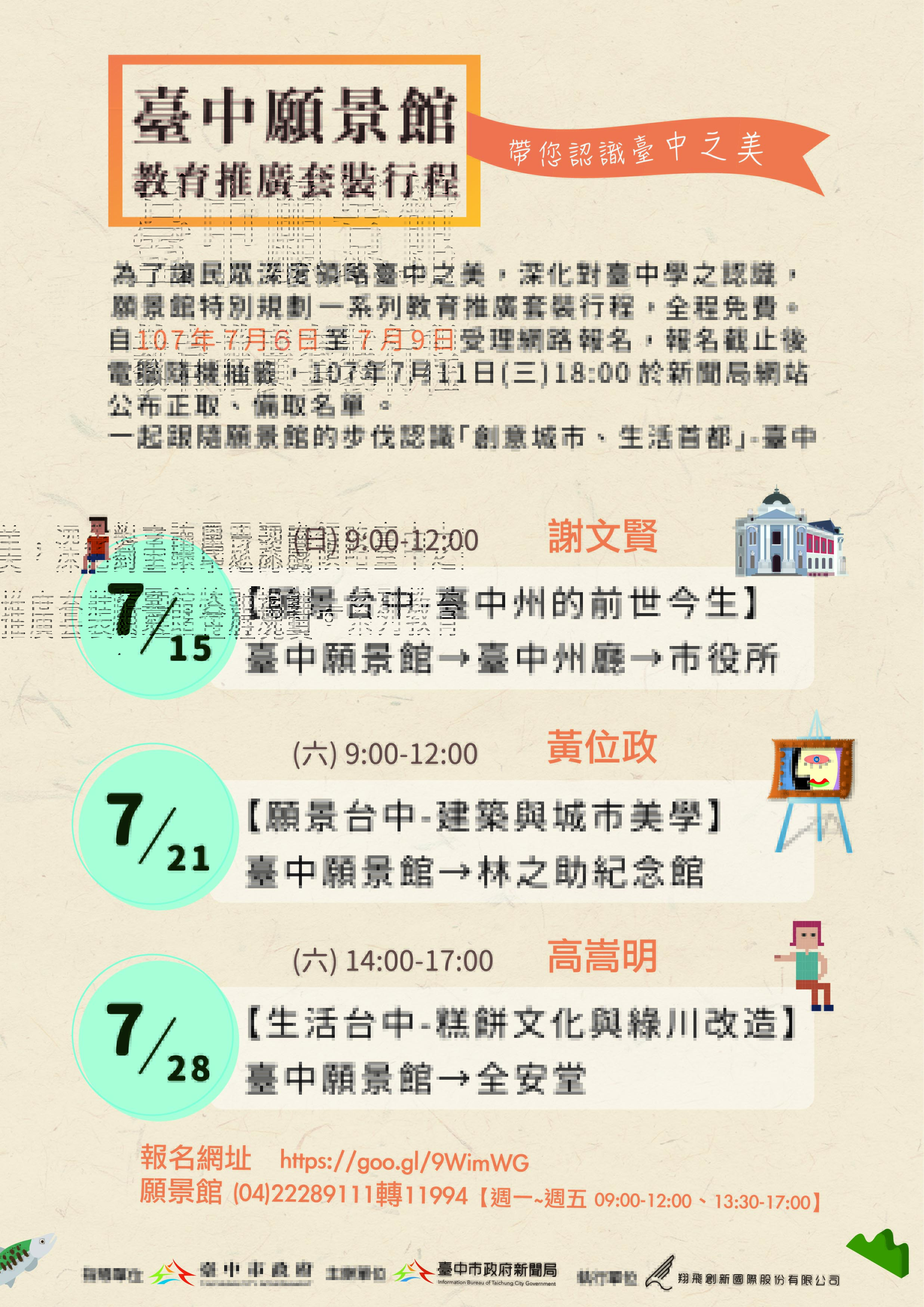 新聞局指出,這次活動全程免費,共有10場,第一梯共3場(7月15日、7月21日、7月28日),報名截止後由電腦隨機抽籤,預定7月11日18時於新聞局網站公布15位正取、30位備取名單;每個人、每場次可報名1次,包含自己,可攜帶1位同伴參與。詳細資訊可洽台中願景館04-22289111分機11994,網路預約報名網址(https://goo.gl/9WimWG)。(7/6*6)*新聞局