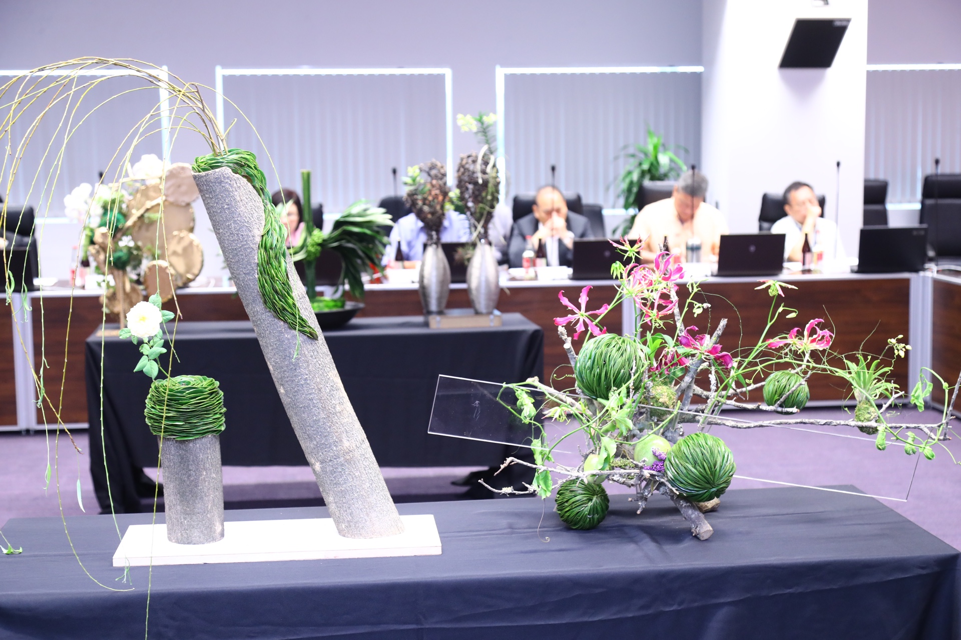 台中花博將於113日開幕,這次不僅是花卉,也是園藝的博覽會,市府特別將今日的市政會議布置得「花團錦簇」,展示11座由台中市花藝設計協會老師們的花藝作品,林市長強調,現場布置的作品主題與花博相互呼應,強調人與土地、植物之間的共生關係。
